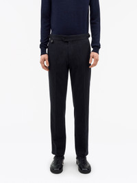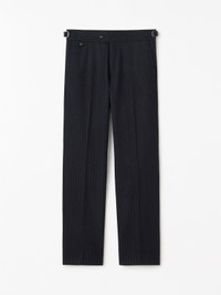 The Tense trousers are a refined update of the classic Tense style, crafted from a sophisticated pinstripe wool-mix fabric. Featuring a mid-rise waist and a tapered straight leg, they offer a tailored yet relaxed silhouette. Functional details include side adjusters with metal buckles, front and back pleats, two side pockets, and two back jet pockets with button closures. The interior is thoughtfully finished with lining at the knees and crotch for added comfort. Signature touches include AMF stitching along the fly and slanted pockets, as well as shell fabric loops on the coin and back pockets, blending subtle tailoring elements with practical design. Product Details - 60% Wool, 35% Polyester Recycled, 5% Polyamide - Based on Tense in a pinstripe wool-mix fabric - Mid-rise fit - Tapered straight leg - Adjusters at sides with metal buckles, front and back pleats - Two back jet pockets, two side pockets - Lining at knees and crotch - AMF stitching at fly and slanted pockets, shell fabric loops on the coin pocket and back pockets with button closure - Made in Romania - Model is 188 cm and wearing a size 48 - For a complete look, wear it with Barnaby C Shirt and Nevile Sweater - Art No.113286227