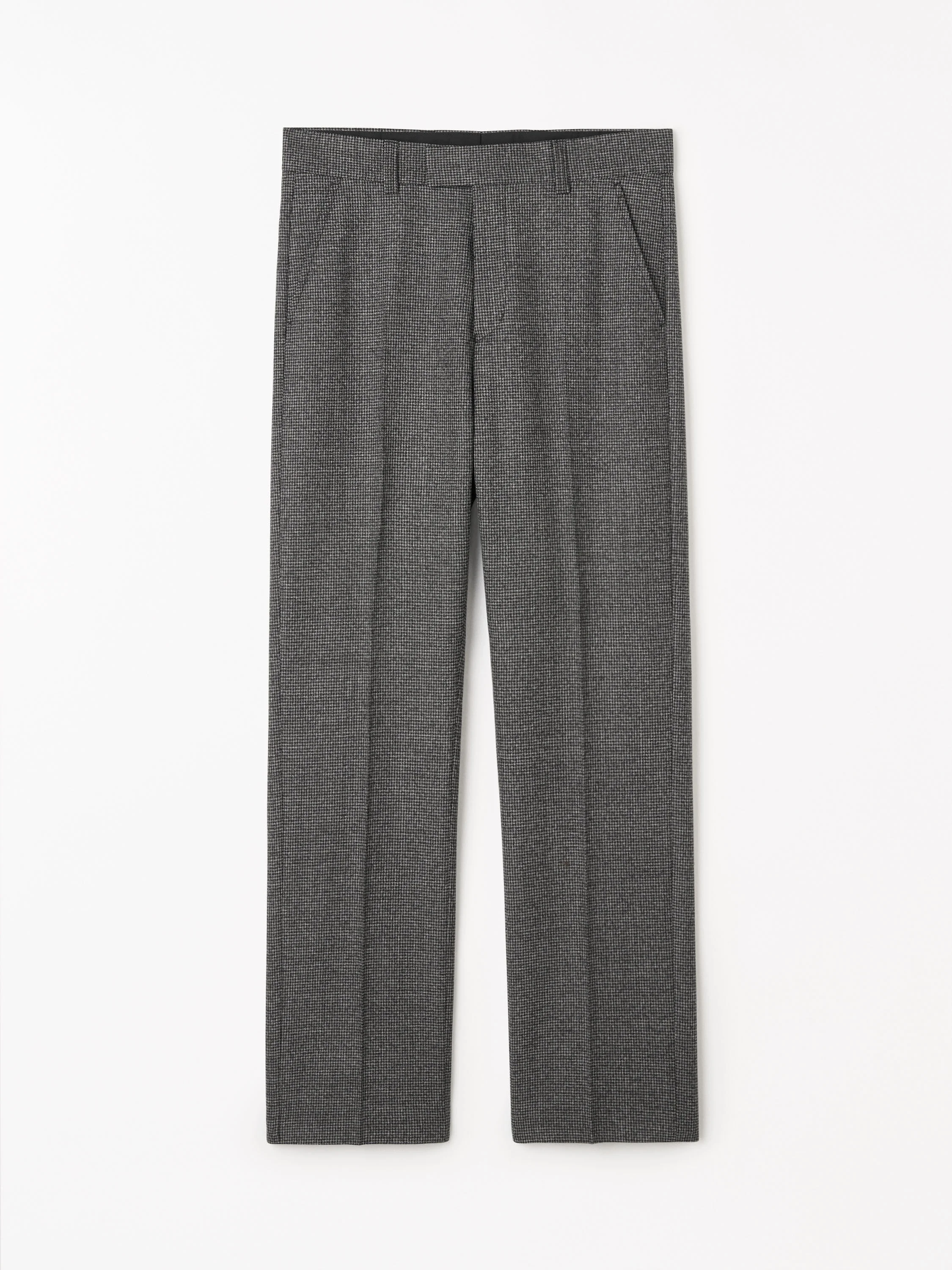 The Tommie is our straight-leg trouser with a slightly higher waist in 100% wool. The elegant top lock combined with a straight leg makes the Tommie a beautiful suit trouser and a great standalone piece with an elegant silhouette. Product Details - 100% Wool - High rise straight-leg trousers - 100% Wool - Slightly higher waist - Pressed crease at front and back - Slanted pockets at front, jet pockets at back - Knee lining - Belt loops - Made in Romania - Model is 188 cm and wearing a size 48 - For a complete look, wear it with Ease Jacket and Spenser Shirt and Forma Shoes and Septa Tie - Art No.113572050