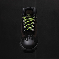 Style TB0A6DSWANQ LOSO is back to bring the heat. In our latest collab, the renowned customizer has reimagined the Waterproof Field Boot with a bold and bespoke twist that features blacked-out embossed flames and pops of neon green. Built to handle moments in the city just as well as miles off-grid, this style combines premium Timberland® leather with 200 grams of PrimaLoft® insulation for warmth and TimberDry™ Waterproof Technology to help keep your feet dry. A leather-lined footbed and supportive polyurethane midsole help cushion long days, while the classic rubber lug outsole promotes confident, all-terrain traction. It's complete with 100% recycled PET laces and a ReBOTL™ lining containing at least 50% recycled plastic. Features Premium Timberland® Leather By purchasing this product, you are supporting Leather Working Group certified tanneries https://www.leatherworkinggroup.com/ ReBOTL™ Material The ReBOTL™ material used in Timberland® apparel contains at least 40% recycled PET (recycled polyethylene terephthalate, the stuff plastic bottles are made of). The ReBOTL™ material used in Timberland® footwear and accessories contains at least 50% recycled PET. (Excepting trace materials) PrimaLoft® Insulation PrimaLoft® insulation is a soft, lightweight compressible down alternative insulation. It uses a patented microfiber structure to help retain warmth, even if the fibers get wet - helping you stay dry, warm and comfortable. Anti-Fatigue Technology A comfort system, adopted from Timberland PRO, designed with shock-absorbing, geometrical technology that returns energy back to the foot to deliver all-day support and comfort. TimberDry™ Waterproof Technology A waterproof membrane made with at least 50% recycled plastic. Waterproof Footwear Our waterproof footwear incorporates a variety of advanced waterproofing materials, treatments and processes. We start with waterproof leathers that are sealed as part of the tanning process; we then either seam-seal the footwear or use an internal waterproof breathable membrane to help feet stay dry. Tongues and zippers treated with durable water resistant coatings utilize integrated gussets, to further deter water entry. Product Detail - Upper made with waterproof Premium Timberland® leather and mesh fabric - Embossed black flame design at toe - D-ring lacing system - Comes with two sets of laces - black and neon green - Padded collar - Embossed flame hangtag - 200 grams of PrimaLoft® insulation - ReBOTL™ fabric lining containing at least 50% recycled PET plastic - Pops of green at side tree logo and tongue - Anti-fatigue removable footbed - Fiberglass shank for arch support - TimberDry™ waterproof membrane - Rubber lug outsole - Imported