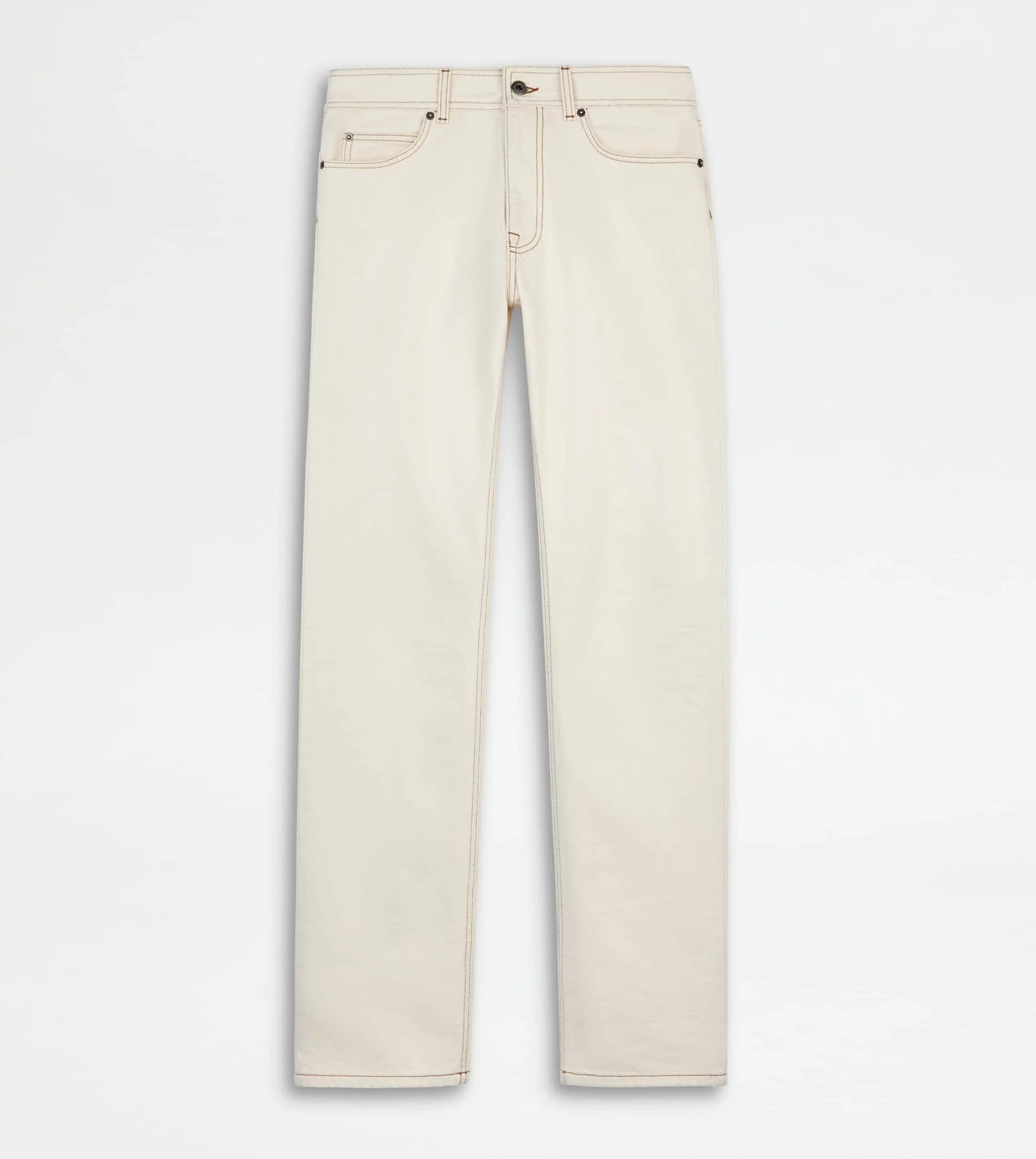 Regular-fit 5-pocket jeans in cotton. A true wardrobe evergreen, with branded metal rivets and leather Tod's tag on the coin pocket. - Made in Italy - 5 Pocket Jeans - Item composition: 100% cotton, leather detailing - Fitting: regular - Maintenance and care cards included