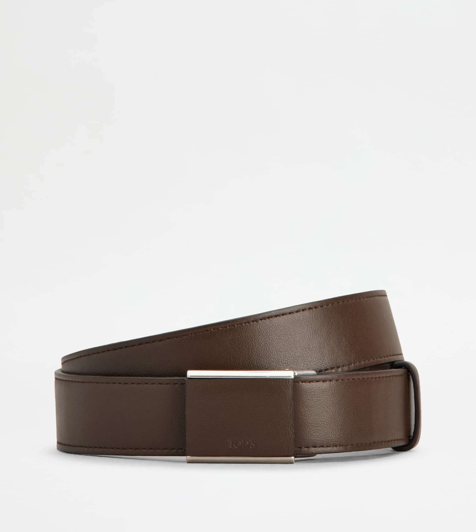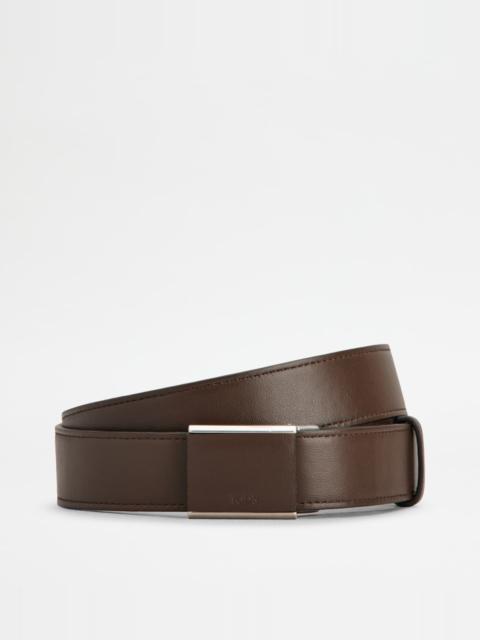 Belt in soft calfskin leather, with covered box buckle and stamped Tod's logo. An accessory with casual elegance, suited to any look. - Made in Italy - Belt in leather - Item crafted in calfskin leather - Metal and leather buckle - Belt width: 1.2 ins - Maintenance and care cards included - Branded dustbag