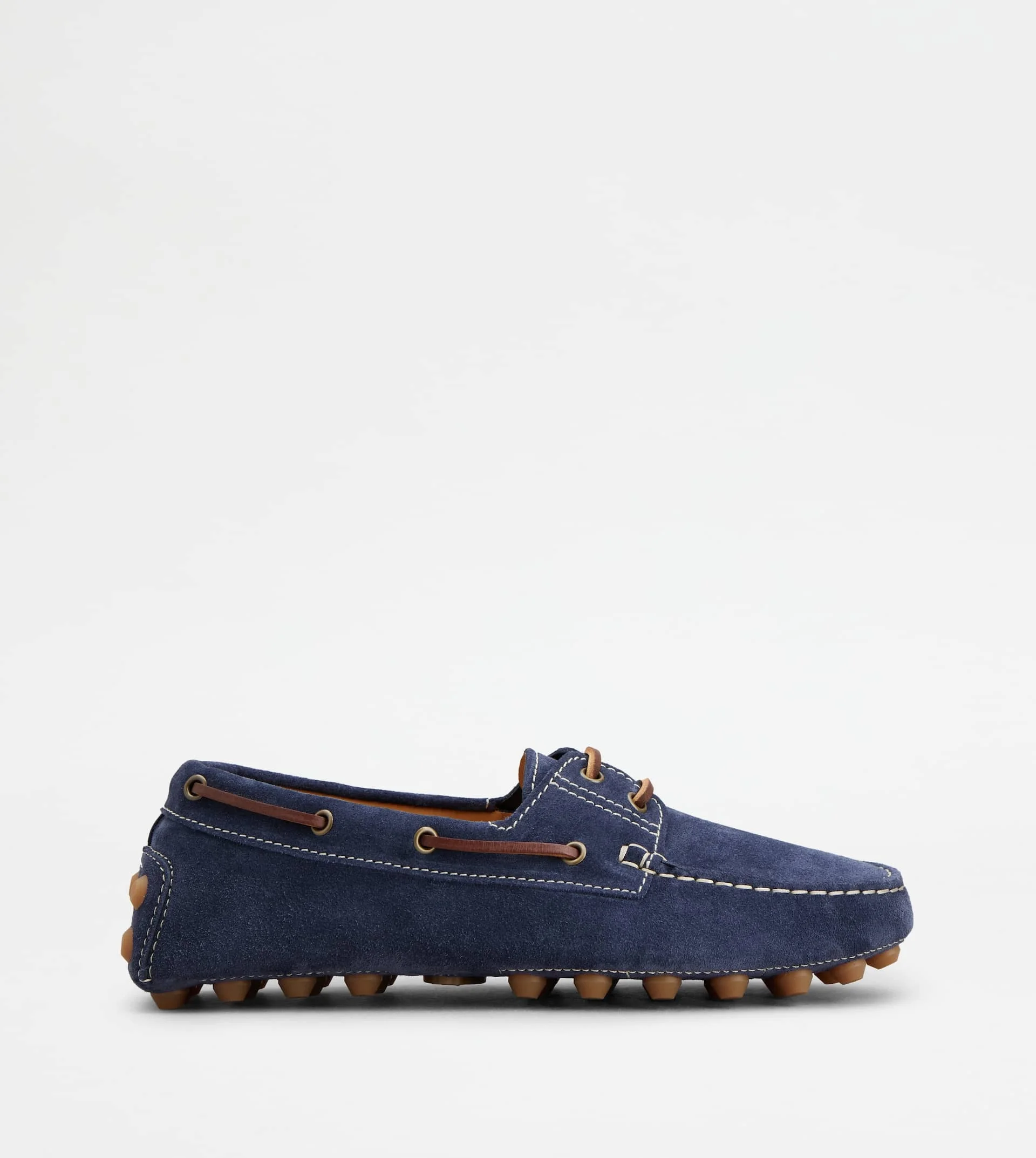 The Gommino Bubble style emphasizes the iconic rubber pebble feature in a contemporary key. Result of a careful craftsmanship, they come here in a boat lace-up version. Crafted in refined calfskin suede, they come with maxi rubber pebbles on the outsole and heel. - Made in Italy - Men's Boat Gommino - Calfskin suede upper - Stamped Tod's monogram - Leather woven ties - Leather insole - Rubber pebble detailing on the heel - Iconic rubber pebble outsole - Maintenance and care cards included - Branded dustbag