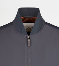 Bomber jacket in comfortable stretch fabric, with water-repellent, windproof and breathable membrane. Lined in wool jersey, it comes with two vertical pockets and a zip fastening. The leather upper zip pull comes with the distinctive T-stitching, recalled by the hand-embroidered Tod's monogram. Featuring a leather insert at the back of the collar, this urban garment combines functionality and cult of detailing. - Made in Italy - Water-repellent bomber jacket - Fitting: regular - The model is 6' 2'' and wears size M (IT) - Item composition: 64% polyamide, 21% polyurethane, 15% elastane, knit hems 96% polyamide, 4% elastane, body lining 100% virgin wool, sleeve lining 100% cupro, padding 100% polyester, leather detailing - Maintenance and care cards included