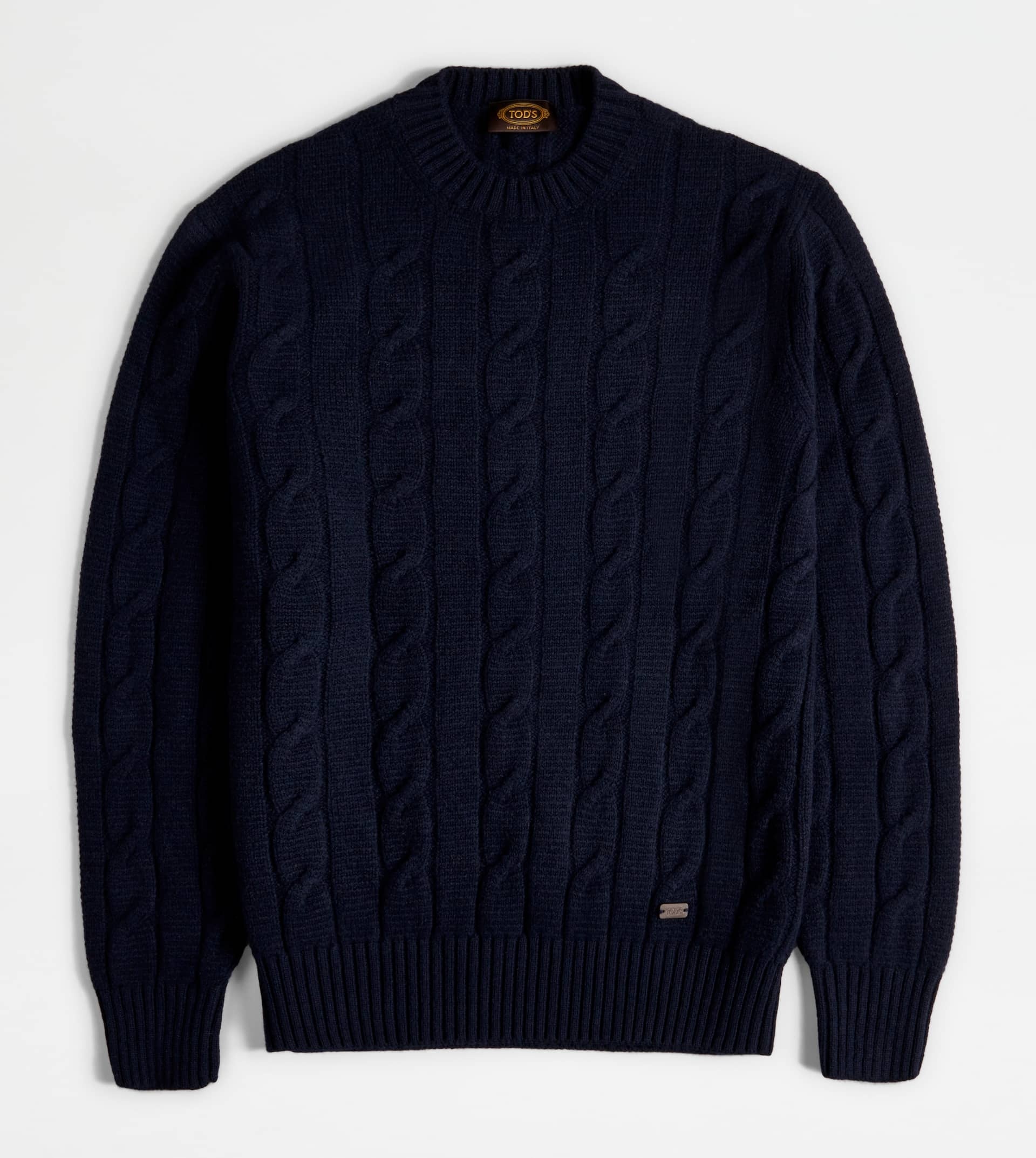 Round-neck pullover in cashmere blend knit with braided knitting. A refined autumn-winter wardrobe evergreen, enriched by the leather tag on the bottom with stamped Tod's logo. - Made in Italy - Cashmere blend pullover - Item composition: 70% wool, 30% cashmere - Maintenance and care cards included