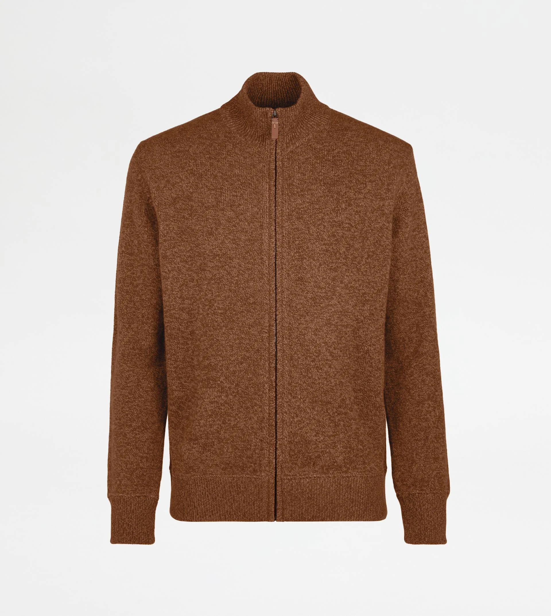 Half-neck cardigan in wool and cashmere mouline knit. Fastened with a double-slider zip, it features the T-stitching on the upper zip pull and the leather Tod's tag applied on the back. - Made in Italy - Cashmere blend cardigan - Fitting: regular - The model is 6' 2'' and wears size M (IT) - Item composition: 85% virgin wool, 15% cashmere, leather detailing - Maintenance and care cards included