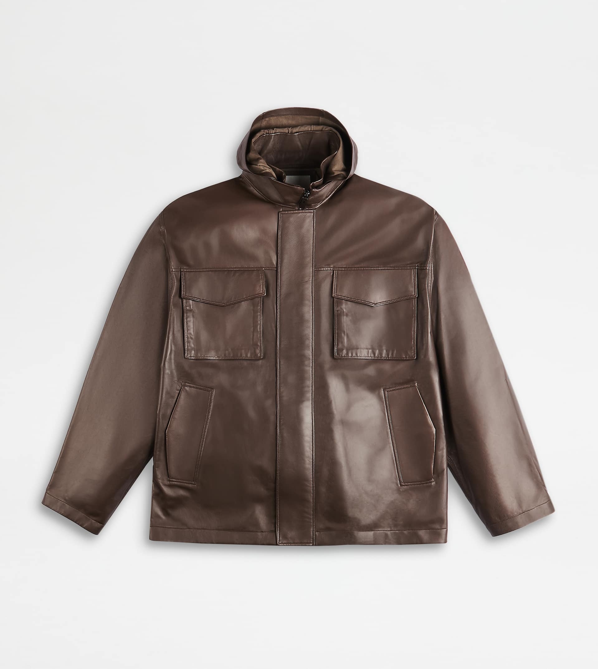 Unlined Field jacket with removable hood, crafted in a particularly soft and lightweight nappa leather. Characterized by flap upper pockets and welt lower pockets, it is fastened with a concealed zip. The T monogram embroidered on the zip pull is recalled by the detail at the center of the shoulders. - Made in Italy - Jacket in leather - Item composition: 100% ovine leather - Fitting: comfort - Maintenance and care cards included