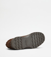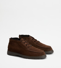 Desert boots in suede, with a warm shearling lining. Characterized by elastic drawstring with branded metal slider, they feature a rubber outsole with embossed rubber pebbles. An informal and versatile style, enriched by the distinctive rubber pebbles on the heel. - Made in Italy - Men's desert boots - Calfskin suede upper - Elastic drawstring with branded slider - Shearling lining and insole - Rubber pebble detailing on the heel - Rubber outsole with grooving and embossed rubber pebbles - Maintenance and care cards included - Branded dustbag
