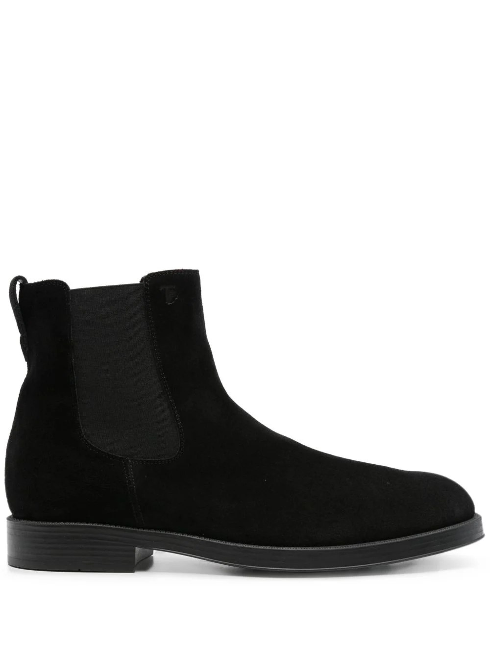 elastic-panel suede Chelsea boots Highlights - Black - Suede - Elastic side panels - Almond toe - Flat heel - Pull tab Made in Italy Composition Lining: Fabric 100%, Calf Leather 100% Outer: Fabric 100%, Calf Suede 100% Sole: Rubber 100% SIZE & FIT Measurement HEEL 1.18 in(3 cm)