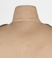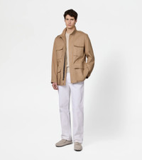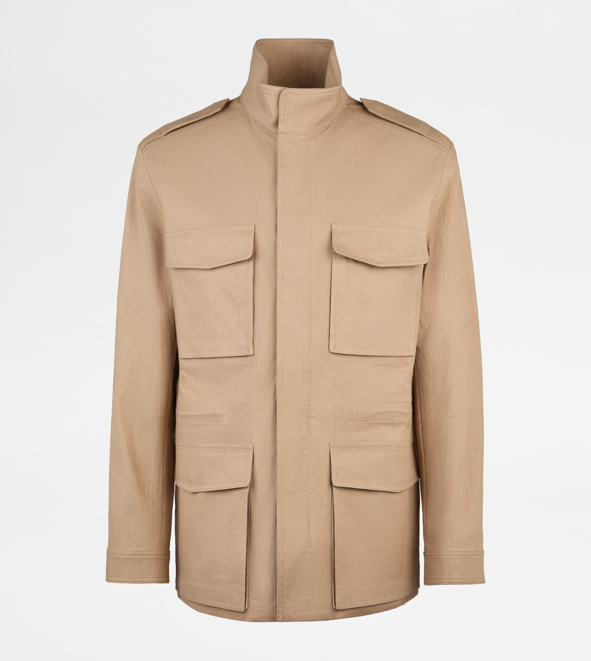Field jacket characterized by frogs on the shoulders and four pockets with flap and button, the lower ones featuring double access. Crafted in precious linen, with temperature regulating properties and a particularly soft hand, it is covered by a water-repellent internal membrane. Finished with heat-sealed internal stitching, the jacket features the T embroidery on the upper leather zip pull and on the back, at the center of the shoulders. - Made in Italy - Field jacket in linen - The model is 6' 2'' and wears size M (IT) - Item composition: 100% Sahara Soft linen with polyurethane membrane, interior 100% polyester, detailing 100% polyurethane, ovine leather detailing - Fitting: regular - Maintenance and care cards included