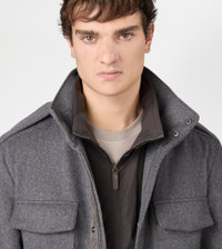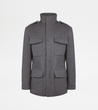 Characterized by flap pockets and invisible snap, this field jacket with high collar features an internal drawstring waistband. Crafted in wool drap with water-repellent membrane, it is fastened with snaps and double-slider concealed zip, profiled with leather tape. An urban garment featuring refined detailing, complemented by the Tod's monogram hand-embroidered on the back. - Made in Italy - Field jacket in wool - Fitting: regular - The model is 6' 2'' and wears size M (IT) - Item composition: 100% wool with polyurethane coating, body lining 100% cotton, sleeve lining 100% cupro, leather detailing - Maintenance and care cards included