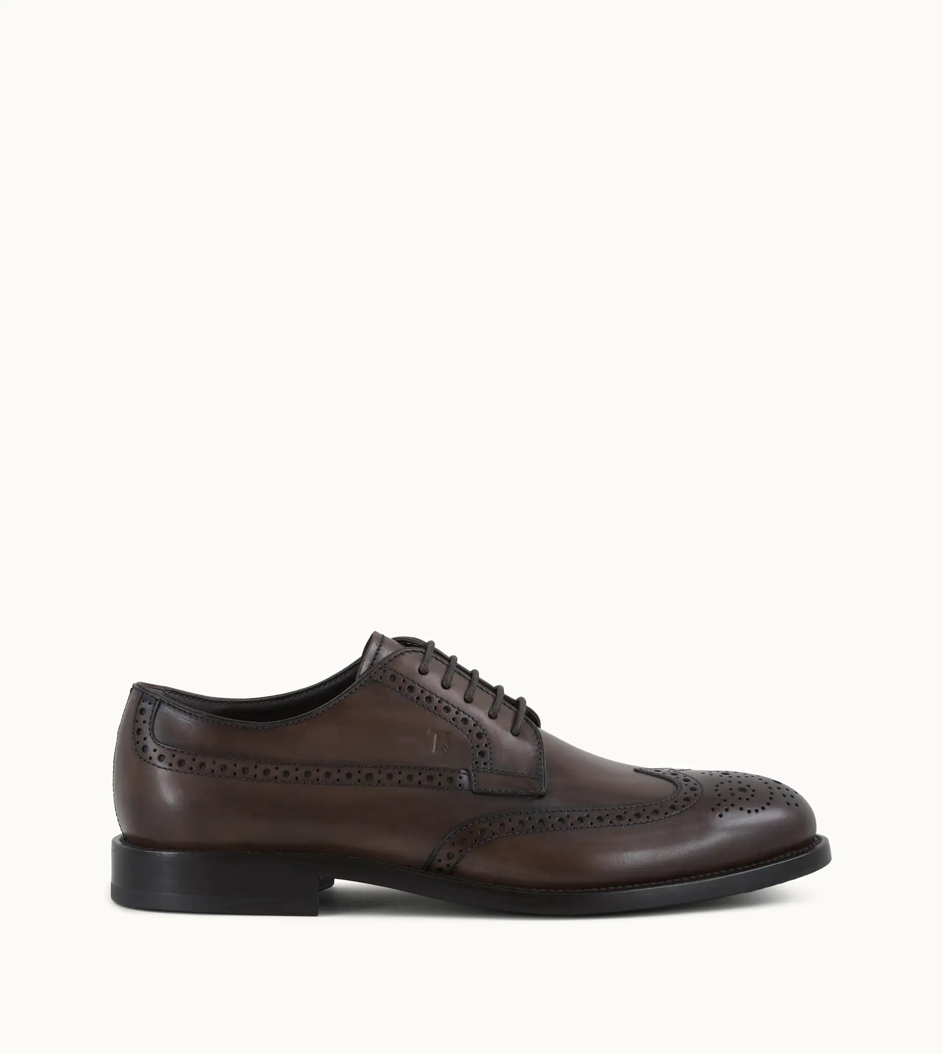 Lace-up shoes in antiqued semi-glossy leather with English-style wingtip perforations, stamped Tod's monogram and leather outsole with rubber insert and embossed rubber pebbles. - Made in Italy - Men's lace-up shoes - Leather upper - English-style wingtip perforations - Stamped Tod's monogram - Leather interior - Leather outsole with rubber insert and embossed rubber pebbles - Care and maintenance instructions included - Branded dustbag included