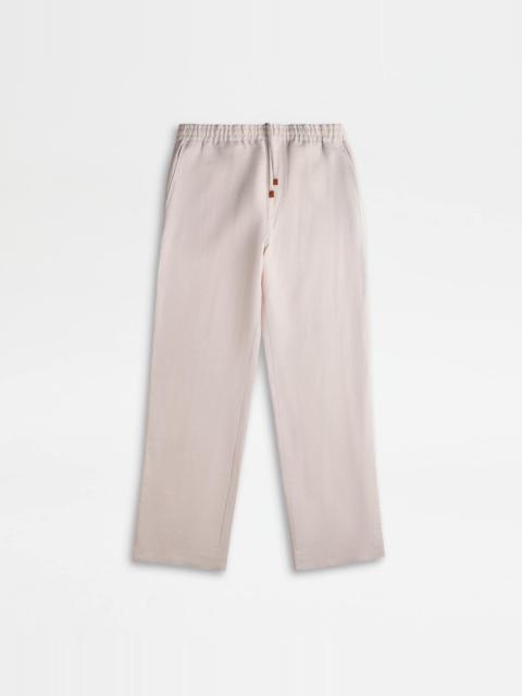 Pants with drawstring, crafted in linen blend cotton. Featuring an elastic waistband, they come with slanted front pockets and the leather Tod's tag on the back pocket. A true spring-summer look passe-partout. - Made in Italy - Pants with drawstring - The model is 6' 2'' and wears size M (IT) - Item composition: 52% cotton, 48% linen, lined parts 100% cotton, leather detailing - Fitting: regular - Maintenance and care cards included