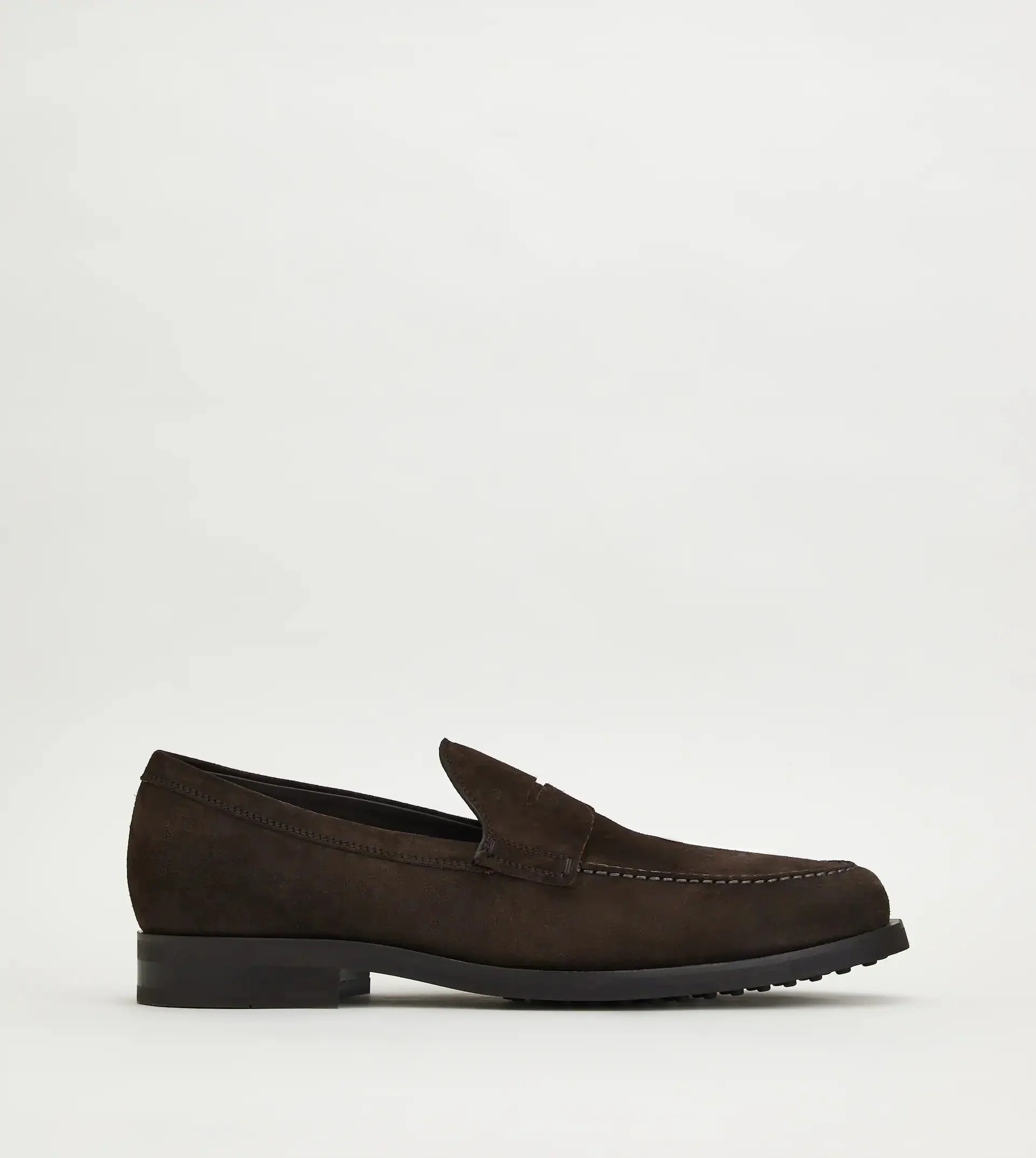 Loafers in suede with penny bar, Tod's stamped monogram and a rubber outsole with embossed pebbles. - Made in Italy - Men's Tod's Loafers - Tod's stamped monogram - Exposed hand-stitching - Penny bar - Rubber outsole with embossed pebbles - Care and maintenance instructions included - Branded dustbag included