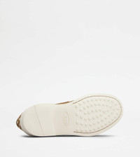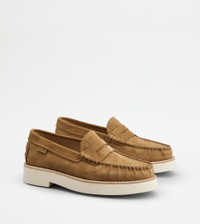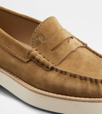 Loafers in calfskin suede with penny bar, Tod's monogram stamped on the front and rubber pebble detailing on the heel. Finished with exposed handmade stitching, they come with a leather welt and extralight rubber outsole with embossed rubber pebbles. An informal style with a fresh and casual look, enhanced by the Tod's tag stitched on the hem. - Made in Italy - Rubber outsole loafers - Calfskin suede upper - Penny bar - Stamped Tod's monogram - Side tag with stamped Tod's logo - Leather welt - Leather insole - Rubber outsole with embossed rubber pebbles - Maintenance and care cards included - Branded dustbag