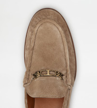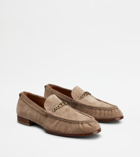 Loafers in rich suede with gathering on the toe and metal T Chain accessory. Characterized by a leather outsole with horseshoe-shaped heel, they are a versatile style, with informal elegance. - Made in Italy - Men's loafers with clip - Suede upper - Metal T Chain accessory - Horseshoe-shaped leather heel with rubber insert - Leather outsole - Maintenance and care cards included - Branded dustbag