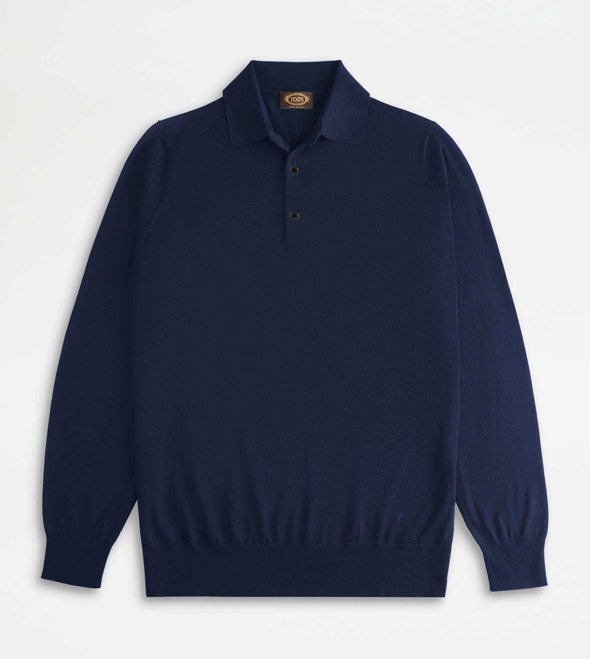 Long-sleeved polo shirt with branded buttons. Crafted in combed wool with 15 micron extra-fine yarn of the highest quality, it comes with the Tod's monogram inlaid on the bottom. - Made in Italy - Polo shirt in wool - The model is 6' 2'' and wears size M (IT) - Item composition: 100% wool - Knit gauge: 18 - Maintenance and care cards included