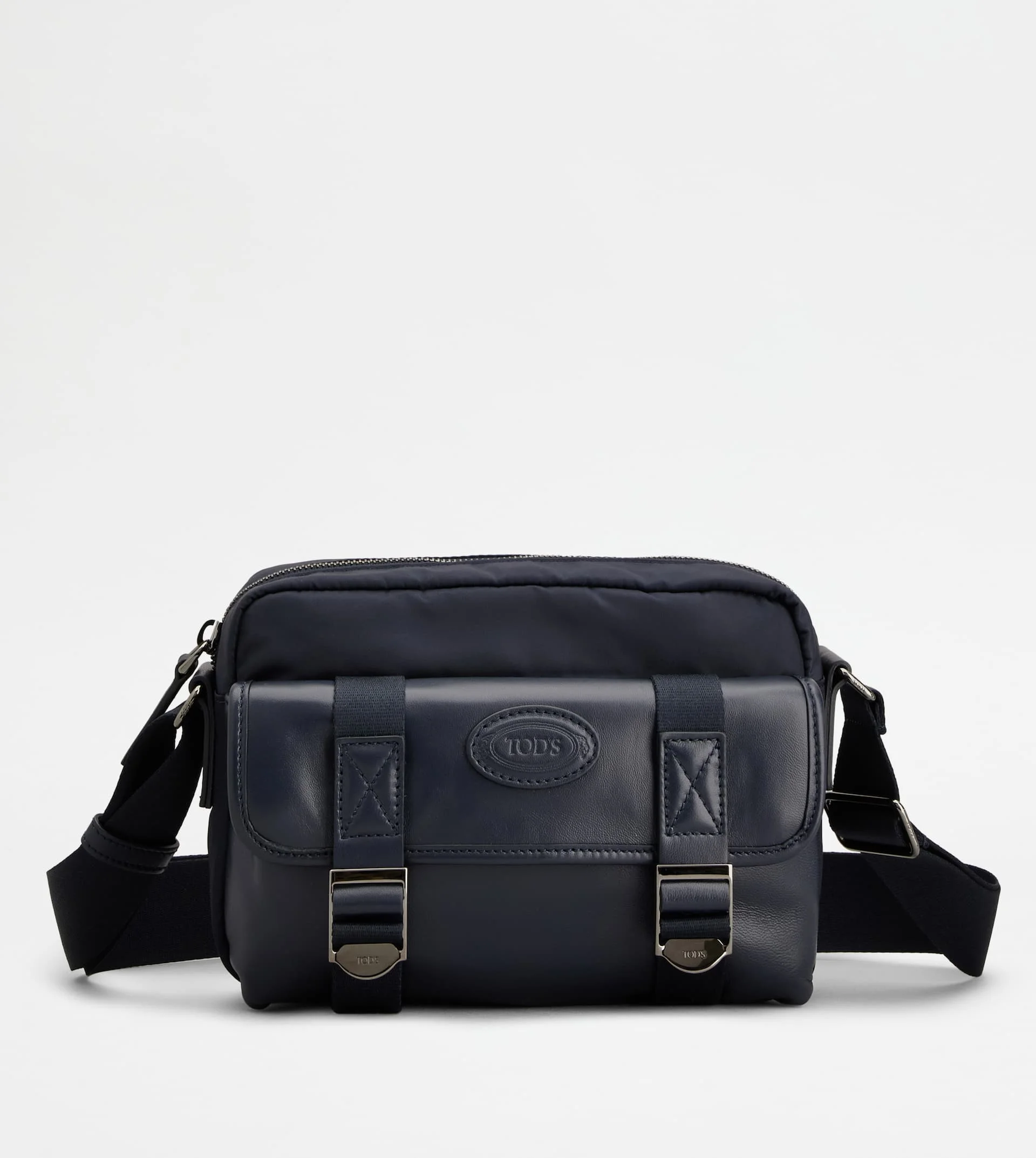 Bag in fabric and nappa leather with adjustable shoulder bag. Characterized by a wide front pocket with Tod's logo and branded buckle, it features a central compartment closed with zip. A refined synthesis of artisanal taste and functionality. - Dimensions: L 9.6 ins x H 6.3 ins x D 4.3 ins - Adjustable shoulder strap in fabric: height (drop) 11.8-25.2 ins - Made in Italy - Tod's messenger bag - Item crafted in nylon and ovine nappa leather - Front pocket with flap and branded metal buckles - Tod's logo stamped on the front - Zip closure - Fabric lining - Maintenance and care cards included - Branded dustbag