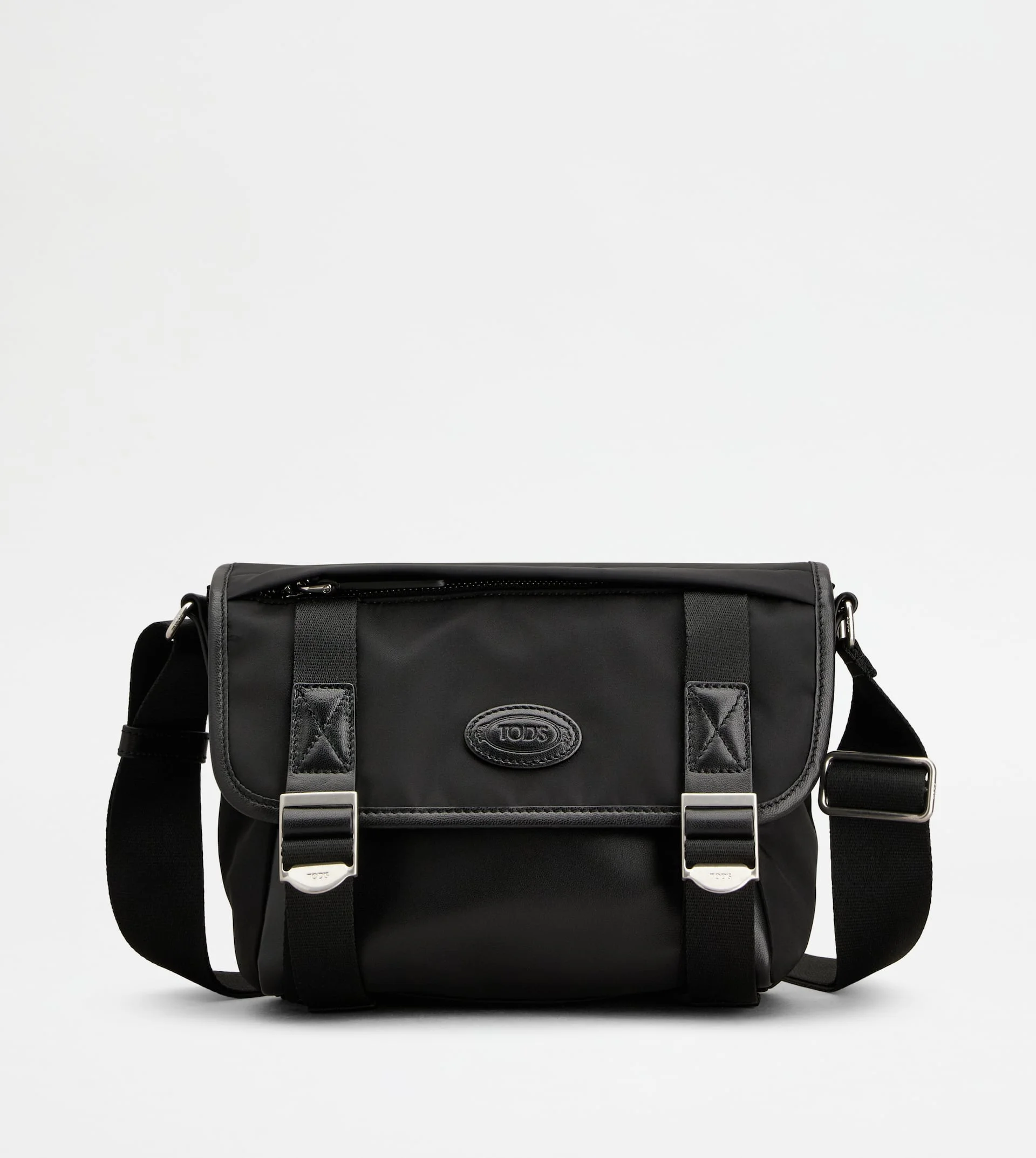 Messenger bag in nylon and nappa leather with Tod's logo stamped on the front. Characterized by a flap with practical pocket and branded buckles, it features an adjustable shoulder strap. - Dimensions: L 10.2 ins x H 7.7 ins x D 3.9 ins - Adjustable shoulder strap: height (drop) 13 - 27.6 ins - Made in Italy - Tod's messenger bag - Item crafted in nylon and ovine nappa leather - 1 zipped pocket on the front - Tod's logo stamped on the front - Flap, buckle and snap closure - Fabric lining - 1 internal zipped pocket - Maintenance and care cards included - Branded dustbag