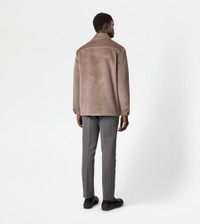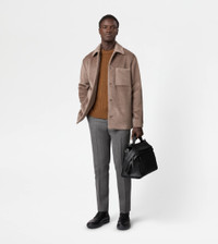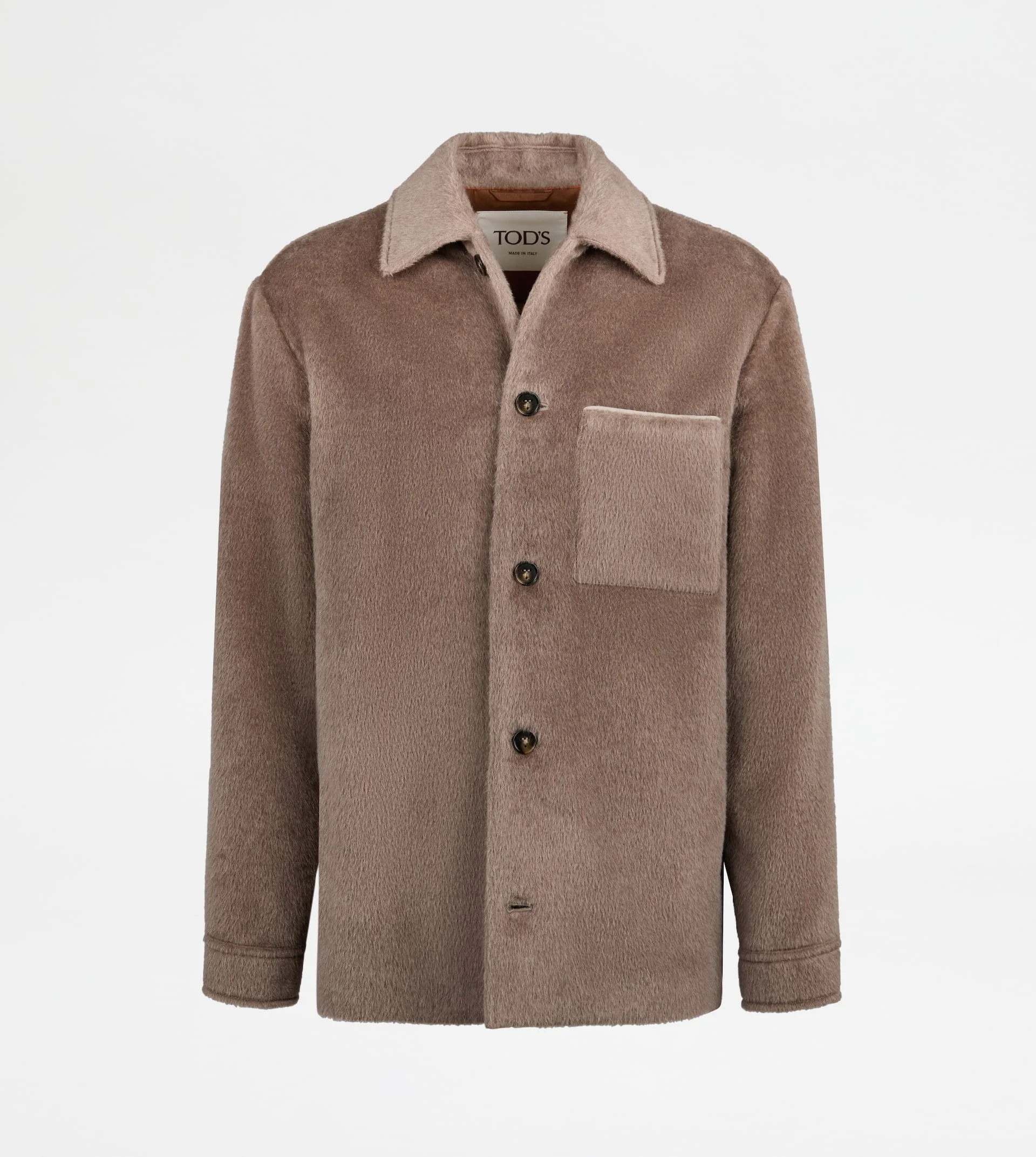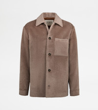 Overshirt in precious baby llama blend wool, with a soft and velvety hand. Featuring a breast pocket, it comes with buttons with the distinctive T-stitching. The back of this garment is enriched by a leather undercollar and hand-embroidered Tod's monogram. - Made in Italy - Shirt style jacket - Fitting: relaxed - The model is 6' 2'' and wears size M (IT) - Item composition: 55% llama wool, 45% virgin wool, ovine leather detailing, body lining 100% cotton, sleeve lining 100% cupro - Maintenance and care card included