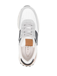 panelled leather sneakers Crafted from mesh with leather inserts, these sneakers combine sporty elements with Tod's refined heritage. The rubber sole features a tread composed of different-sized rubber pebbles, a brand's signature. Highlights - White/multicolour - Canvas/calf leather - Smooth grain - Panelled design - Suede panels - Perforated toebox - Logo patch at the tongue - Logo at the sole - Round toe - Front lace-up fastening - Branded leather insole - Rubber outsole Made in Italy Composition Lining: Fabric 100% Outer: Fabric 100%, Calf Leather 100% Sole: Rubber 100% SIZE & FIT Measurement HEEL 1.77 in(4.5 cm) Sole height 0.59 in(1.5 cm)