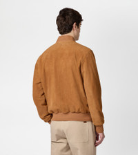 Bomber jacket in suede with anti-drip and anti-stain treatment. A unique material with an exceptional softness, lightweight thanks to its thin thickness yet compact and resistant. Featuring embossed striped ribbed hems, the garment comes with two practical zipped pockets. The T-stitching on the upper leather zip pull is recalled by the detail at the center of the shoulders. - Made in Italy - Suede bomber jacket - Item composition: 100% goatskin leather, knit hems 85% cotton, 13% polyamide, 2% elastane, body lining 100% cotton, sleeve lining 100% cupro, padding 100% polyester - Fitting: regular - Maintenance and care cards included