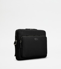 Pouch in nylon with nappa leather detailing and side straps with branded metal buckle. Featuring a zipped front pocket and stamped Tod's logo, it comes with a wide compartment with a double-slider zip. - Dimensions: L 14.2 ins x H 10.2 ins x D 3 ins - Made in Italy - Pouch in fabric - Item crafted in nylon - Ovine nappa leather detailing - Tod's logo stamped on the front - Zipped front pocket - Side straps with metal buckle - Zip closure - Fabric lining - Maintenance and care cards included - Branded dustbag