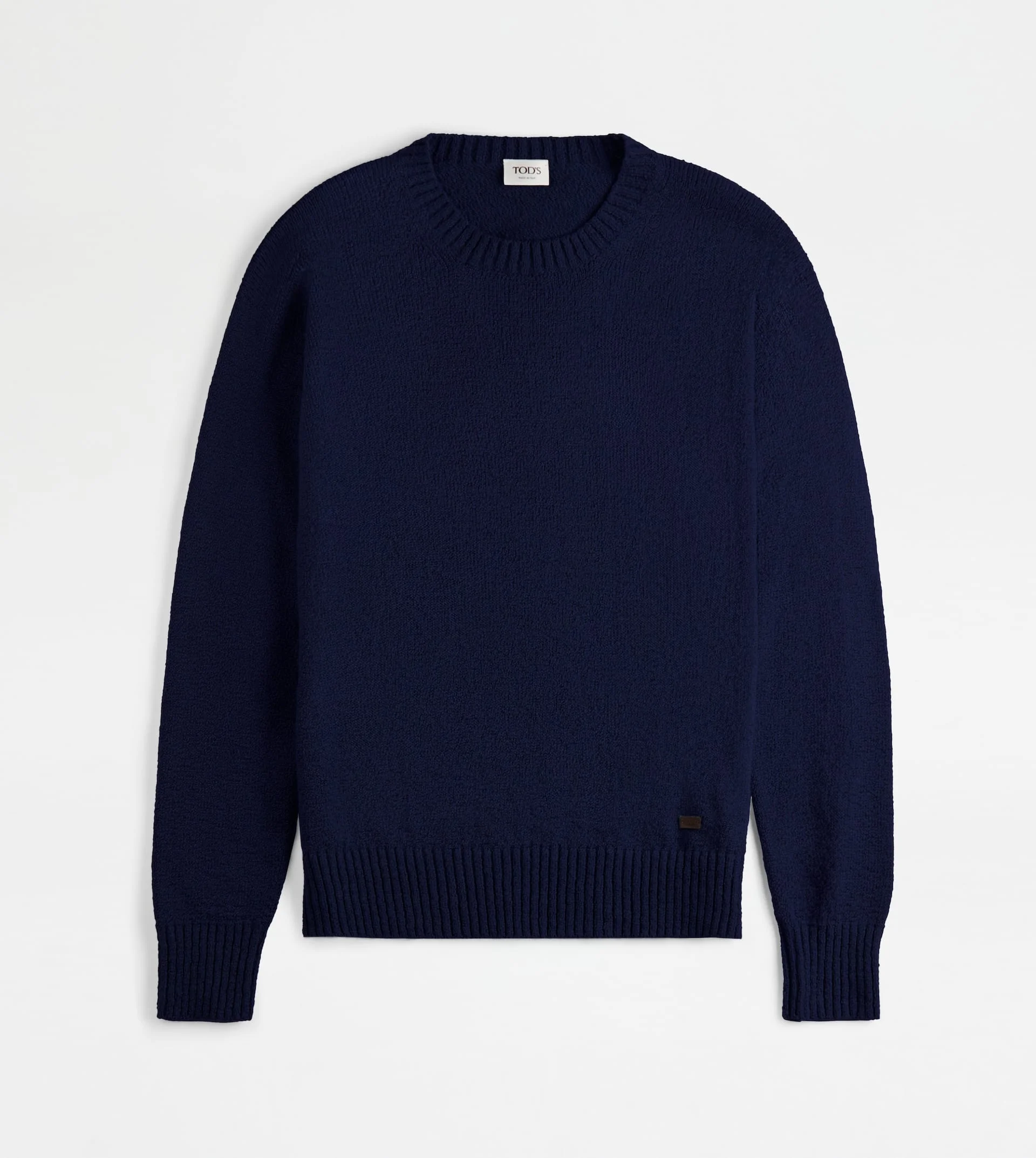 Seamless round-neck pullover in organic Nilo cotton knit, end result of meticulous manufacturing process that combines technology and craftsmanship for an exclusive and fine yarn. A refined wardrobe evergreen, with the leather Tod's tag on the bottom. - Made in Italy - Round-neck pullover in cotton - The model is 6' 2'' and wears size M (IT) - Item composition: 100% Nilo cotton, leather detailing - Fitting: regular - Maintenance and care cards included