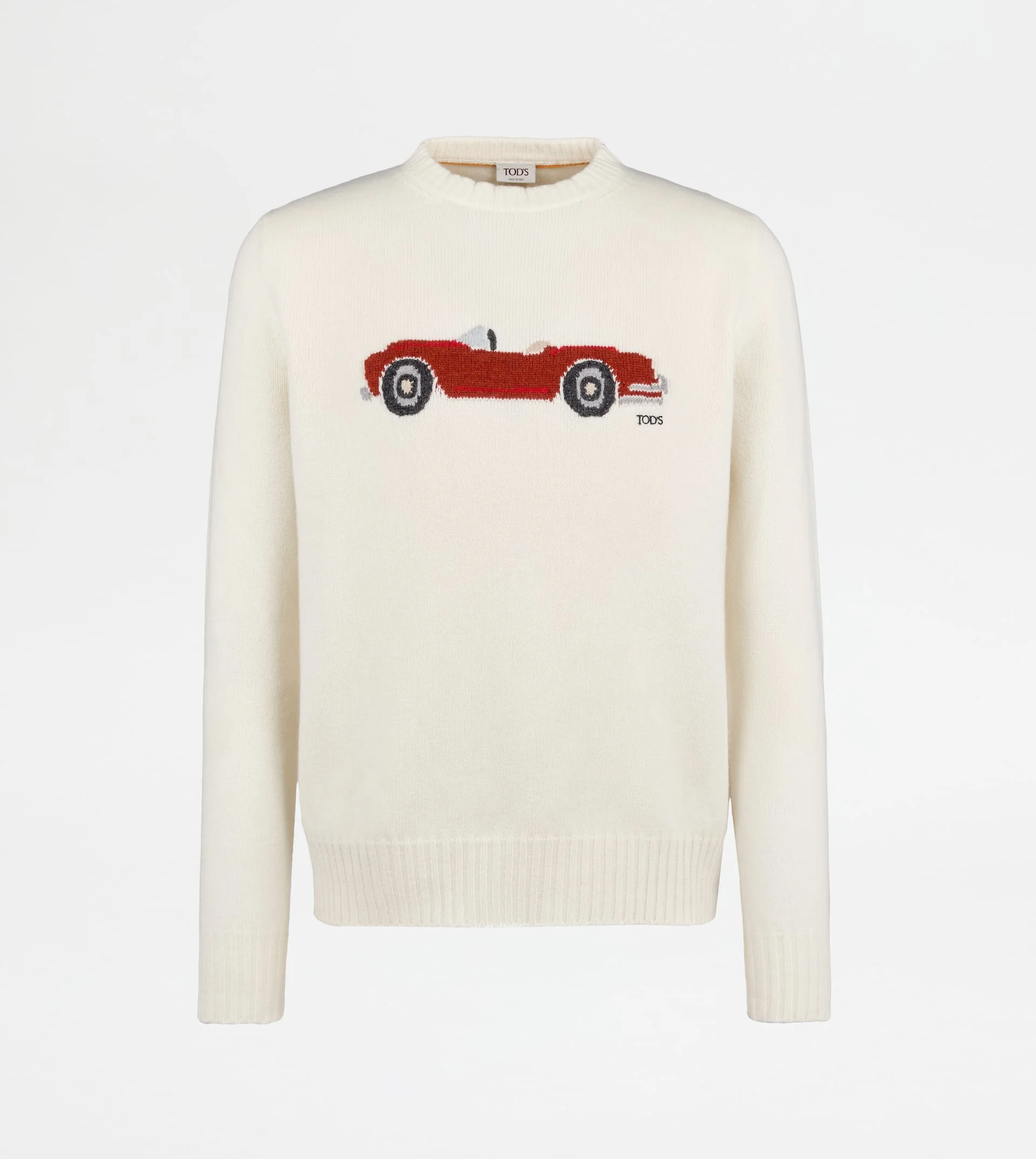 Round-neck pullover in wool and cashmere, with a vintage Italian car-inspired design. A soft and precious garment, with the Tod's logo embroidered on the front and leather logo tag on the back. - Made in Italy - Round-neck pullover - The male model is 6' 2'' and wears size M (IT) - Item composition: 70% extra-fine lambskin wool, 30% cashmere, leather detailing - Maintenance and care cards included