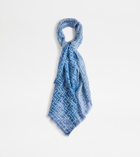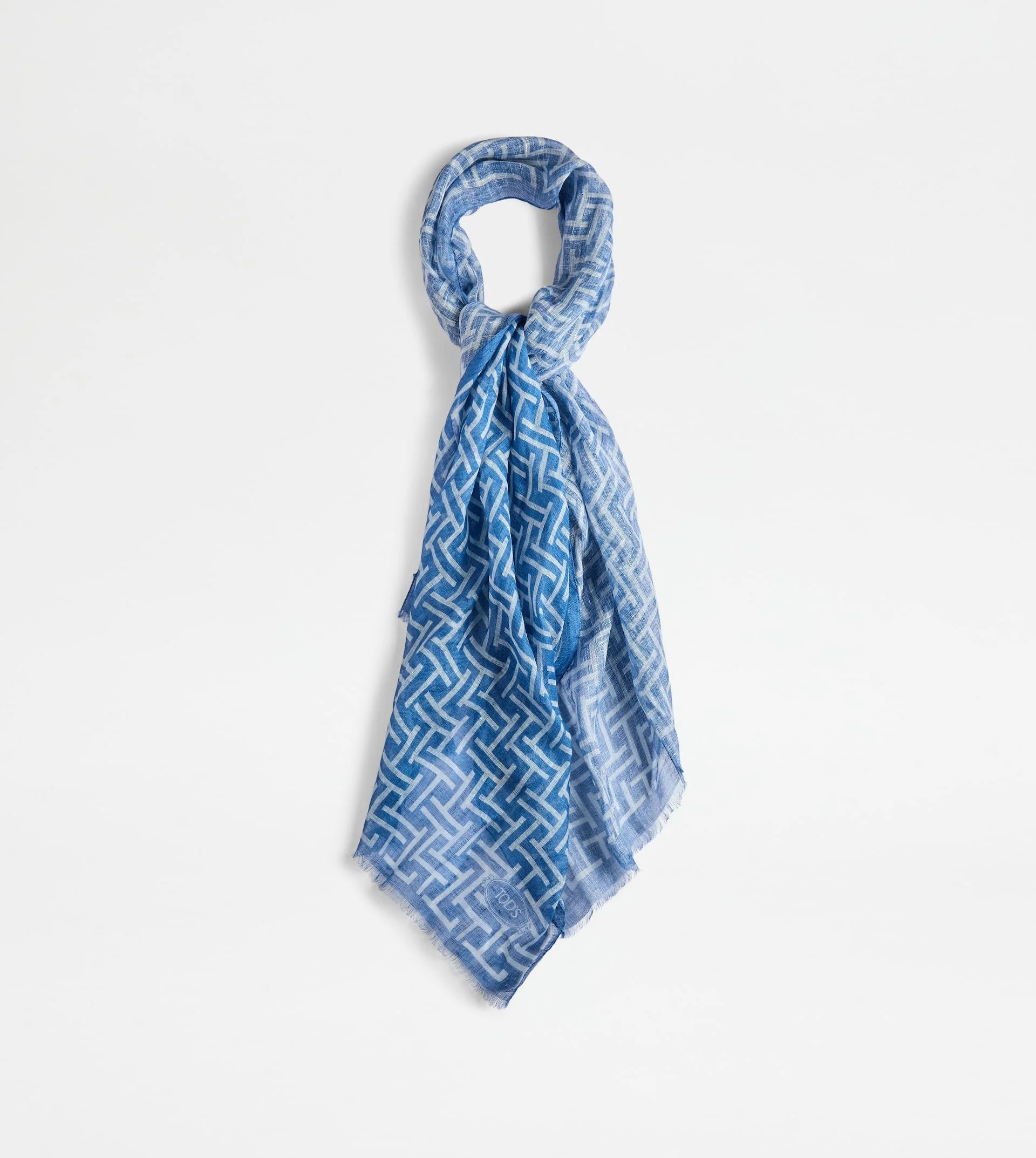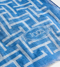 Scarf in linen with fringed hems, branded T pattern print and Tod's logo. A versatile accessory, with timeless elegance. - Made in Italy - Summer scarf - Composition: 100% linen - Dimensions: 68.9 x 25.6 ins - Maintenance and care cards included