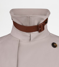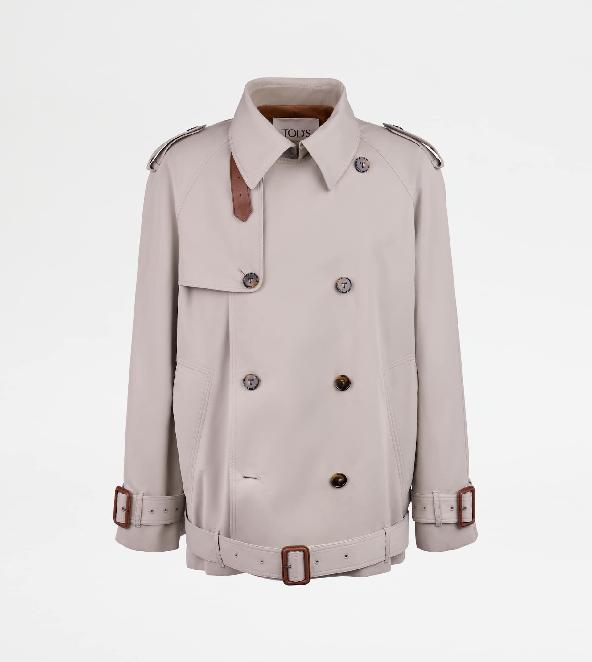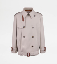 Double-breasted short trench coat in nylon blend with removable strap in leather that allows to close the collar. Fastened with buttons secured with the distinctive T-stitching, it features welt pockets and a waist belt on the bottom with leather covered buckle. A metropolitan garment with timeless appeal, enriched by the Tod's monogram detail embroidered over the shoulders. - Made in Italy - Short Trench Coat - Fitting: comfort - Item composition: 76% polyester, 24% polyamide, lining 100% cotton, sleeve lining 100% cupro, leather detailing - Maintenance and care cards included