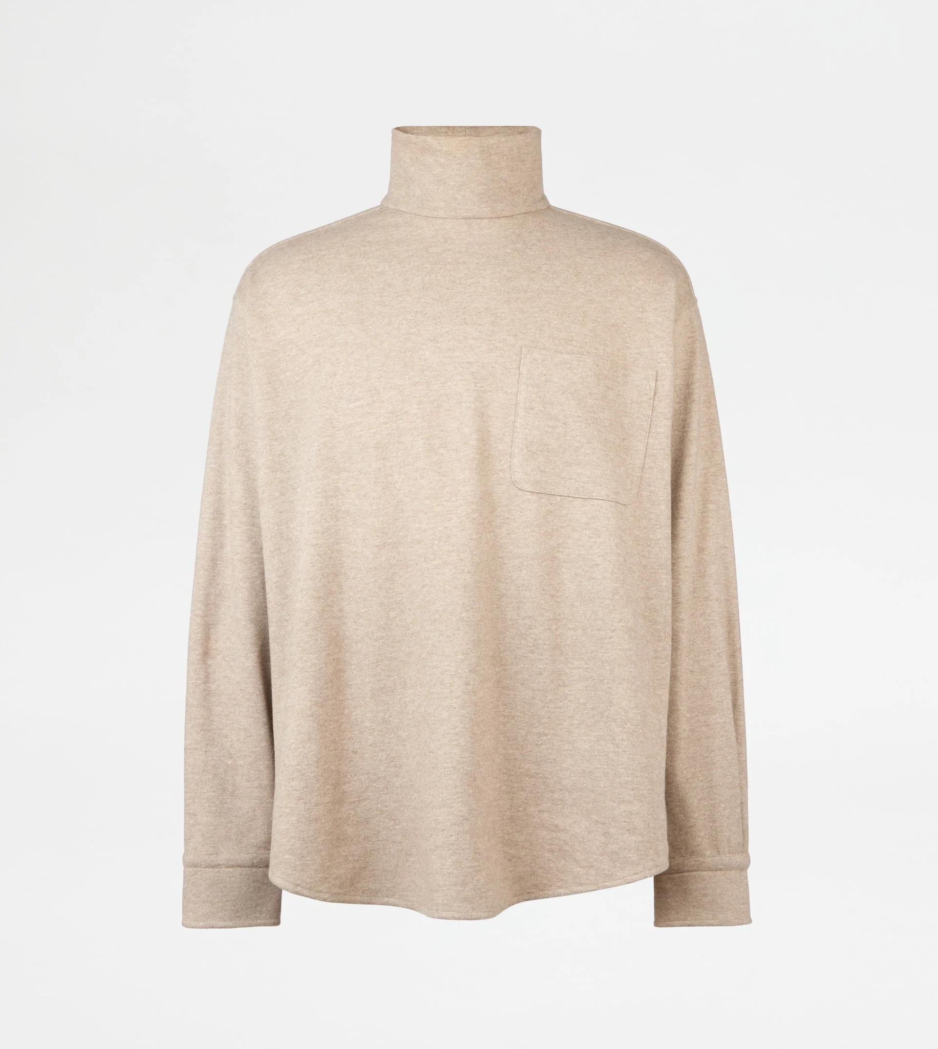 Relaxed-fit turtleneck in soft silk and cashmere blend knit. Featuring a breast pocket, it is enriched by the T monogram hand-embroidered over the shoulders. - Made in Italy - Cashmere blend turtleneck - Fitting: relaxed - The model is 6' 2'' and wears size M (IT) - Item composition: 75% virgin wool, 15% silk, 10% cashmere - Maintenance and care cards included