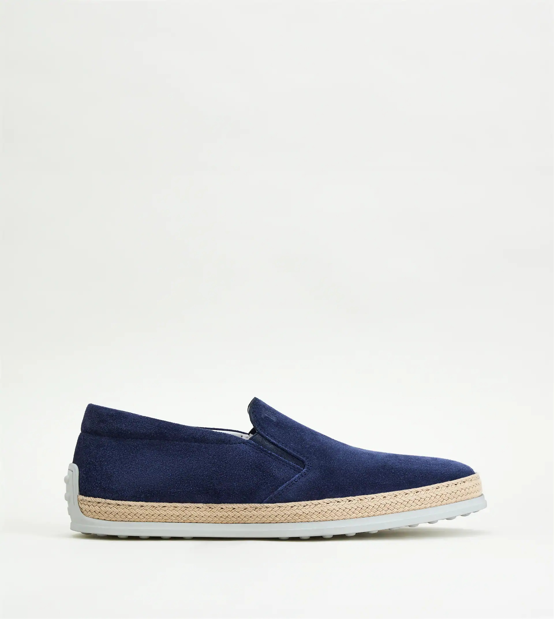 Slip-on shoes in suede with side elastic inserts, handcrafted woven rope trim on the bottom and rubber outsole with embossed pebbles. - Made in Italy - Tod's men's slip-on shoes - Suede upper - Side elastic inserts - Handcrafted woven rope trim on the bottom - Rubber outsole with embossed pebbles - Care and maintenance instructions included - Branded dustbag included