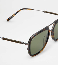 Sunglasses with a slightly squared shape. Characterized by an elegant metal and tortoiseshell acetate frame, they come with metal temples with a refined leather weaving, acetate ends and Tod's logo. - Made in Italy - Men's Tod's Sunglasses - Galvanized metal and acetate frame - Galvanized metal and leather temples - Dimensions: lens width 2.2 ins, nose bridge 0.7 ins, temple length 5.7 ins - UVA/UVB protection - Compliant with EN ISO 12312-1 standard - Branded case