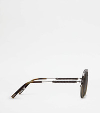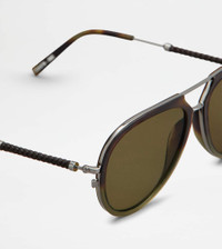 Sunglasses with acetate and metal frame. With timeless style, they come with metal temples featuring a refined leather weaving, acetate ends and Tod's logo. - Made in Italy - Men's Tod's Sunglasses - Acetate and galvanised metal frame - Galvanised metal and leather temples - Dimensions: lens width 2.3 ins, nose bridge 0.6 ins, temple length 5.7 ins - UVA/UVB protection - Compliant with EN ISO 12312-1 standard - Branded case