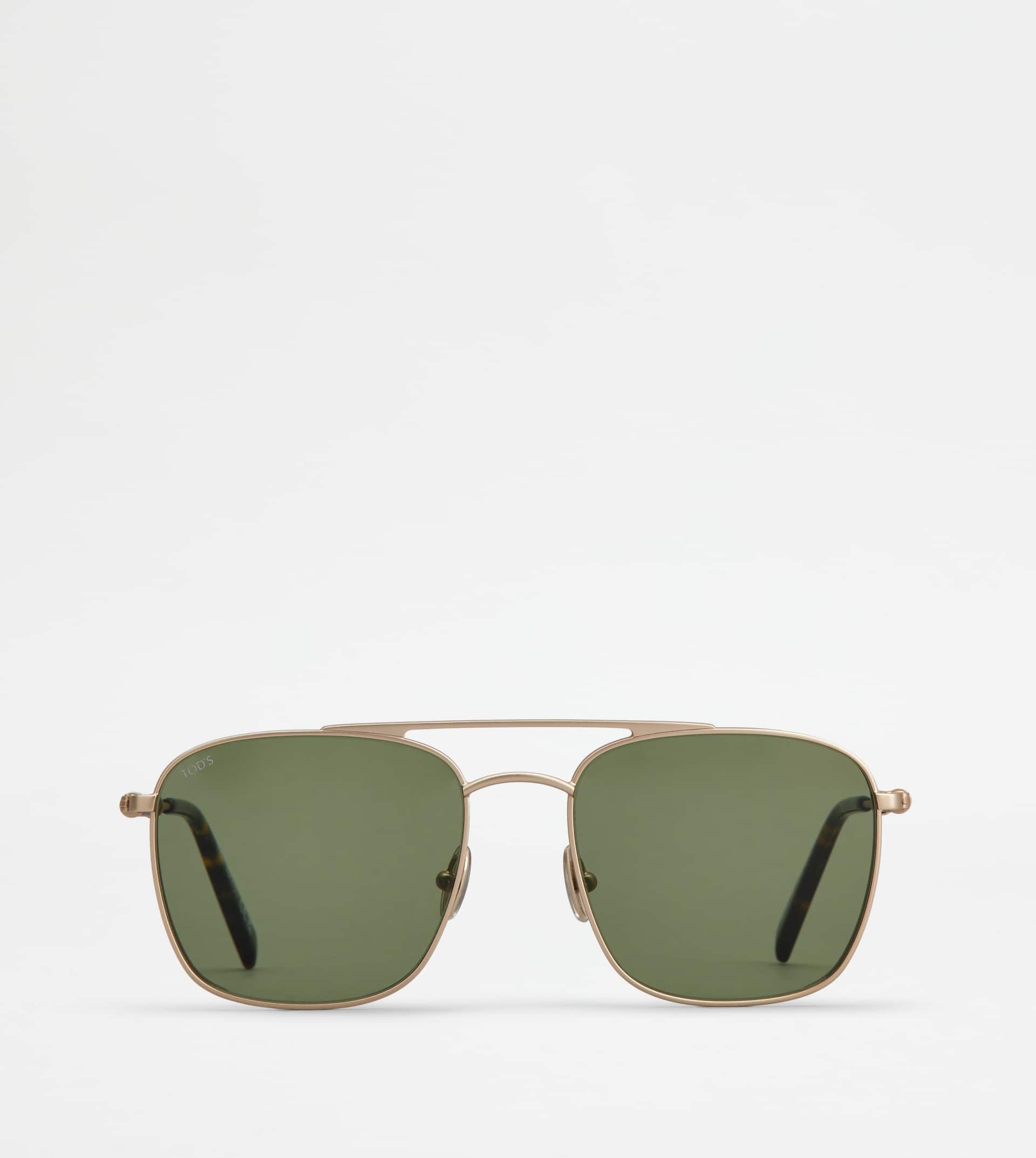 Sunglasses in metal with a slightly squared shape. A refined synthesis of contemporary mood and artisanal taste, with temples characterized by an elegant leather weaving, acetate ends and Tod's logo - Made in Italy - Men's Tod's Sunglasses - Galvanized metal frame - Galvanized metal and leather temples - Dimensions: lens width 2.2 ins, nose bridge 0.7 ins, temple length 5.7 ins - UVA/UVB protection - Compliant with EN ISO 12312-1 standard - Branded case