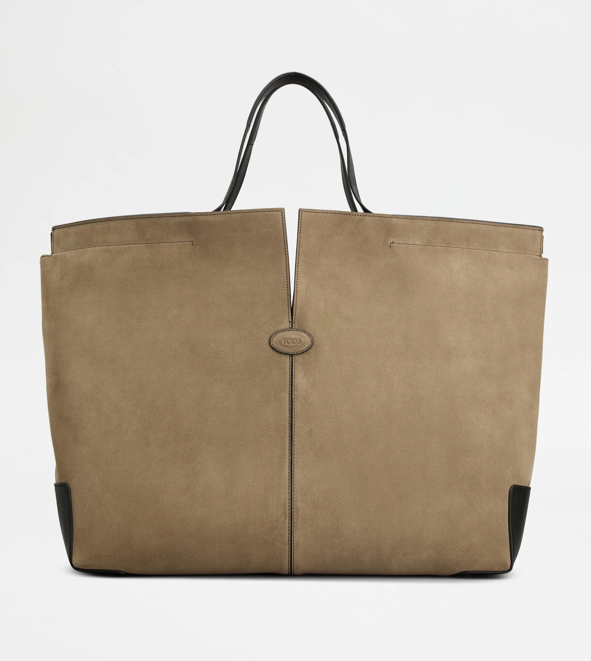Tod's Di Bag Folio shopping draws inspiration from the most sought-after items in the brand's clothing collection. The iconic central stitching with the oval logo opens into an elegant slit. The flat handles are pulled into the top edge like a belt. The suede, light as a fabric, enhances the softness of this spacious deconstructed model, complemented by an internal pouch. - Dimensions: L 22.8 ins x H 14.2 ins x D 7.1 ins - Handles: height (drop) 7.5 ins - Made in Italy - Tod's Di Bag Folio - Item crafted in calfskin suede - Smooth leather inserts - Tod's logo stamped on the front - Branded metal side accessories - Internal removable pouch in smooth leather - Branded metal feet - Maintenance and care cards included - Branded dustbag