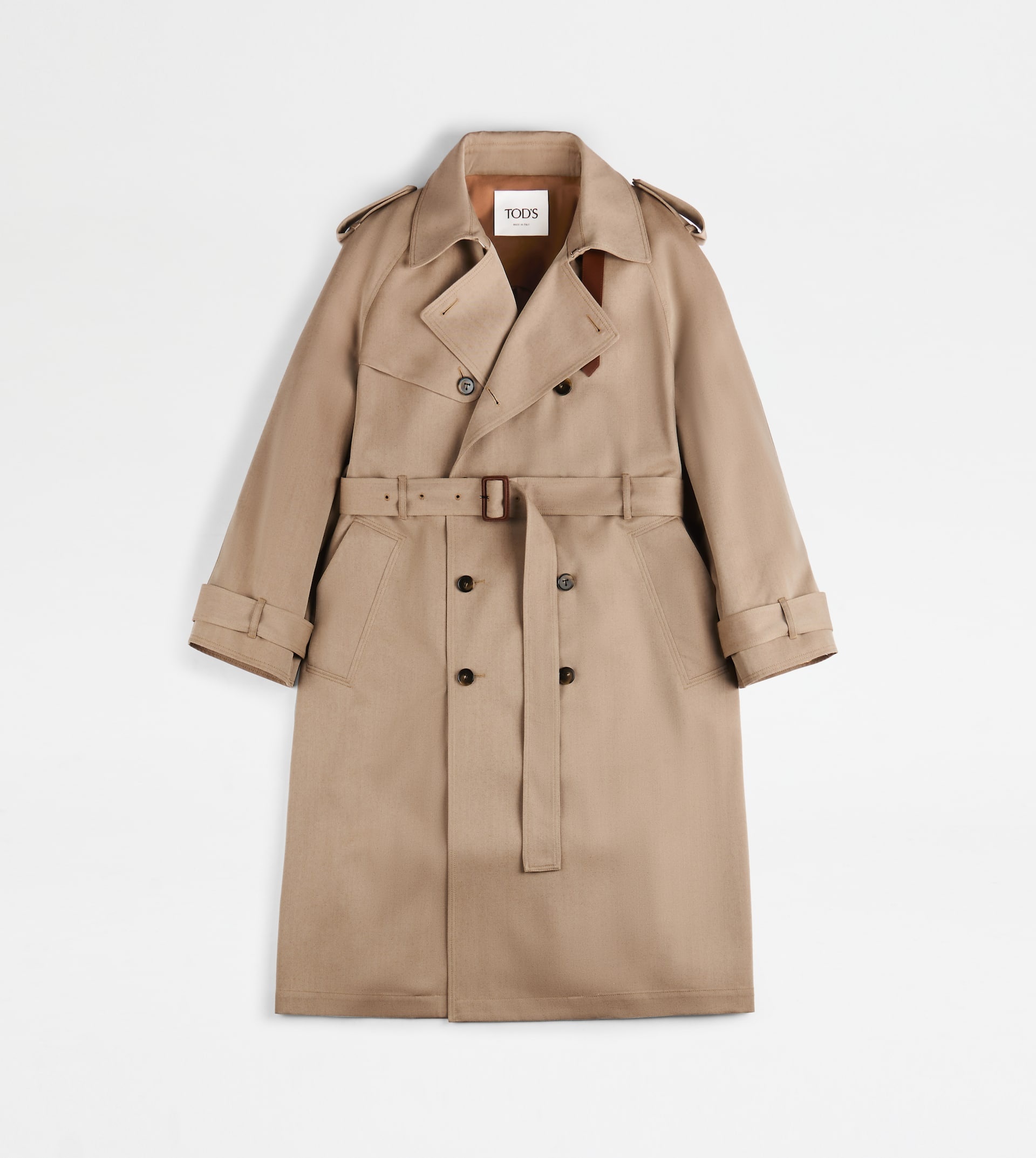 Double-breasted trench coat in virgin wool solaro fabric, with removable strap in leather that allows to close the collar. Fastened with buttons with the distinctive T-stitching, it features welt pockets and a waist belt with leather covered buckle. A metropolitan garment with timeless appeal, enriched by the Tod's monogram detail embroidered over the shoulders. - Made in Italy - Trench coat in iridescent solaro fabric - Item composition: 100% virgin wool, body lining 100% cotton, sleeve lining 100% cupro, leather detailing - Fitting: relaxed - Maintenance and care cards included