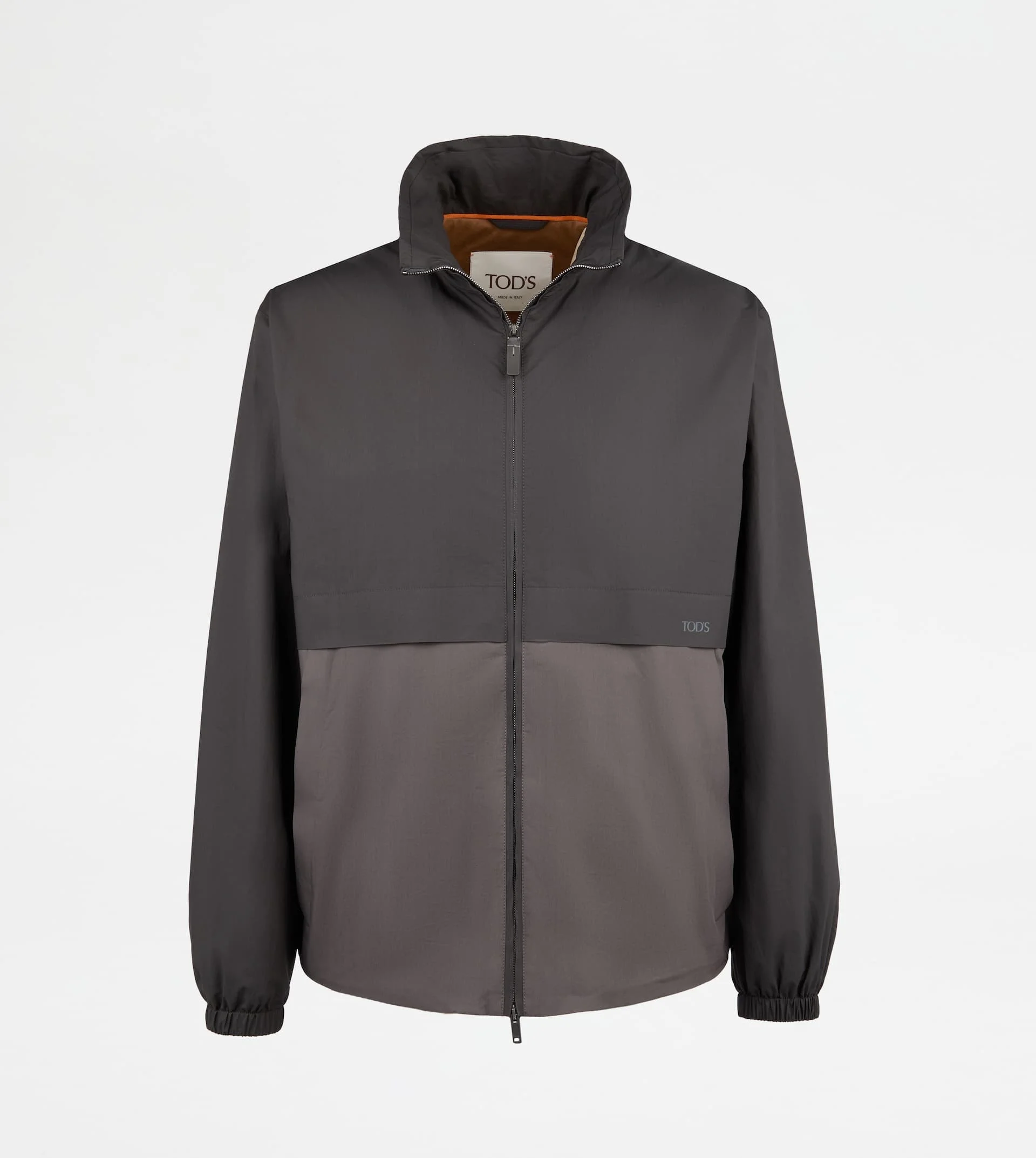 Windbreaker in lightweight cotton with anti-drip finishing. Characterized by a high collar with concealed hood and suede collar band on the back, it comes with welt zipped pockets and the Tod's logo printed on the front. Interpreter of casual urban taste, it comes with the distinctive T-stitching on the upper leather zip pull. - Made in Italy - Windbreaker - Fitting: regular - The male model is 6' 2'' and wears size M (IT) - Item composition: 100% cotton with polyurethane coating, body lining 100% cotton, sleeve lining 100% polyester, ovine leather detailing - Maintenance and care cards included
