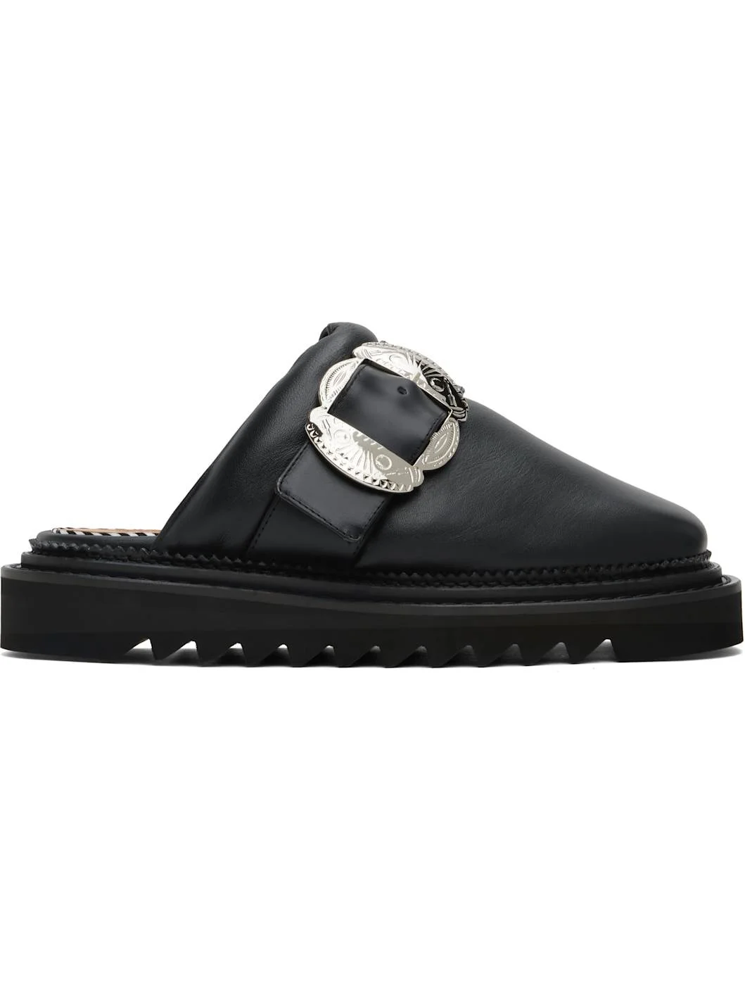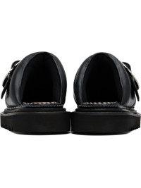 Padded buffed leather slippers in black. · Square toe · Leather pin-buckle strap at vamp · Serrated detailing at welt · Padded buffed leather footbed · Mesh lining · Foam rubber midsole · Treaded rubber sole Supplier color: Black Upper: leather. Sole: rubber. Made in Portugal 242688M231021