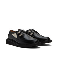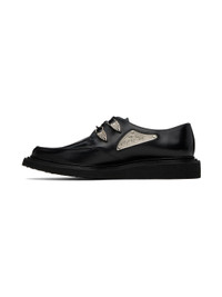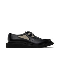 Paneled polished leather derbys in black. · Moc toe · Lace-up closure · Graphic hardware at sides · Buffed leather and suede lining · Platform crepe rubber midsole · Treaded rubber outsole · Platform: H1 in Supplier color: Black/White Upper: leather. Sole: rubber. Made in Portugal 232688M225005