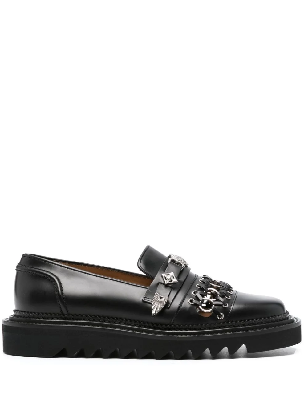 stud-embellished leather loafers Known for their modern embellished takes on classic footwear, Toga Virilis introduces another bold pair of shoes. These black loafers stand out thanks to a cut-out on the front that comes complete with a lace-up and silver-tone eyelet embellishment. Highlights - Black - Leather - Square toe - Whipstitch detailing - Metal eyelet detailing - Strap detailing - Silver-tone stud embellishment - Branded leather insole - Oversize rubber sole - Slip-on style Imported Composition Outer: Bos Taurus 100% Lining: Bos Taurus 100% Sole: Rubber 100% SIZE & FIT Measurement HEEL 1.57 in(4 cm) Sole height 0.78 in(2 cm)