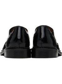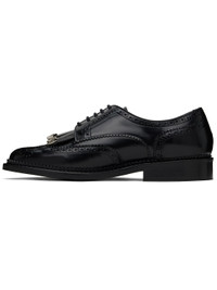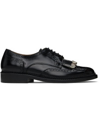 Polished leather derbys in black. · Perforations and serrated detailing throughout · Lace-up closure · Fringed detailing and graphic hardware at vamp · Suede and buffed leather lining · Plaque at stacked leather heel · Leather sole · Heel: H1.25" Supplier color: Black Upper: leather. Sole: leather, rubber. Made in Portugal 251688M225002