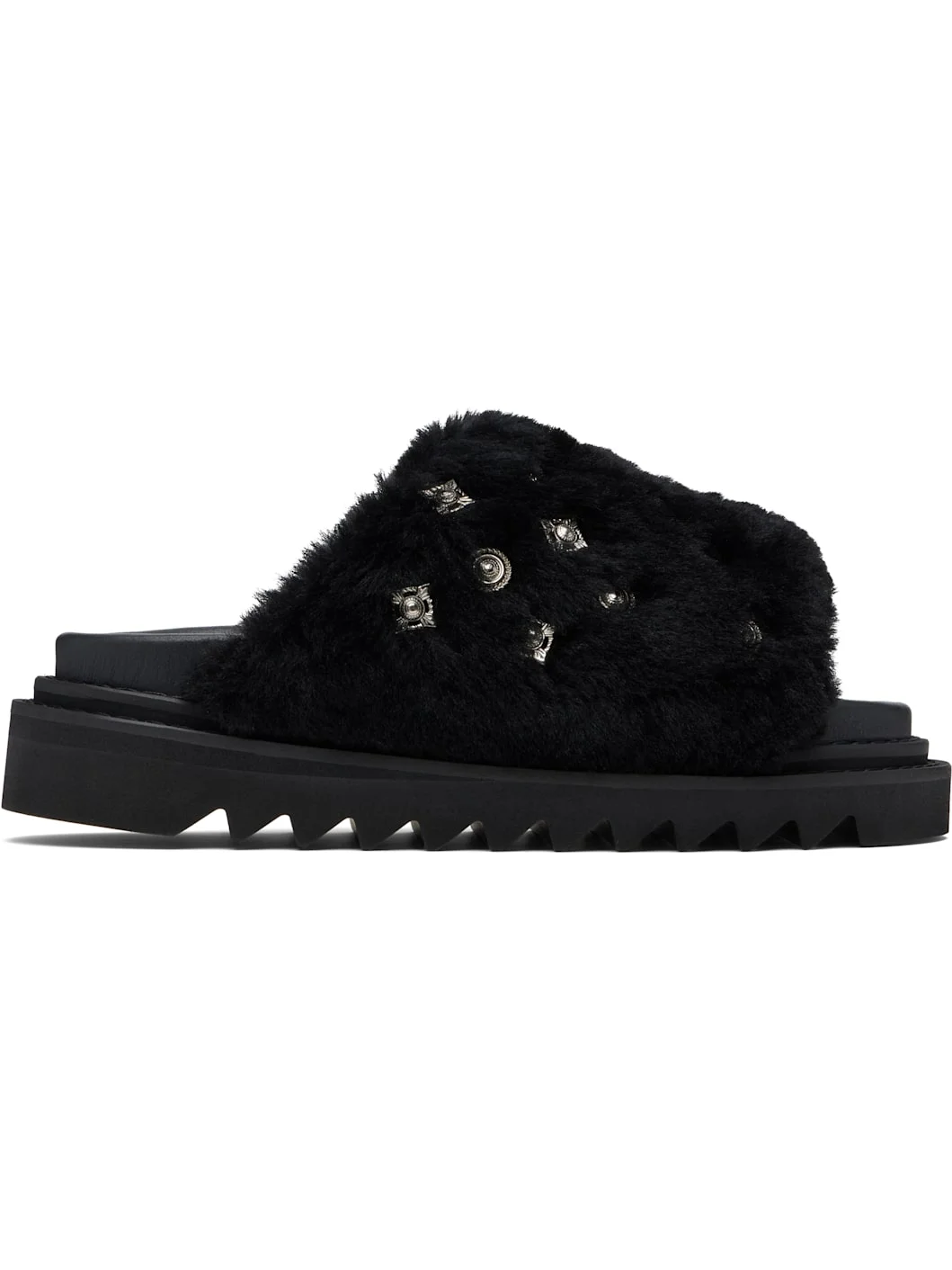 Shearling slip-on sandals. · Graphic hardware throughout · Open toe · Logo stamp at molded footbed · Buffed leather lining · Foam rubber midsole · Treaded rubber sole Supplier color: Black Upper: sheepskin. Sole: rubber. Made in Portugal 252688M234004