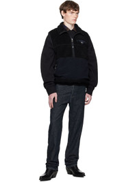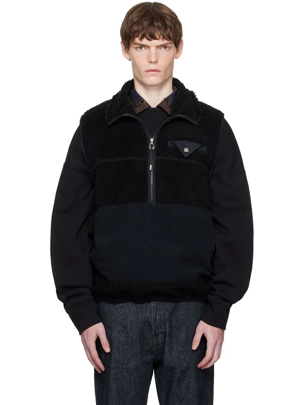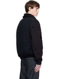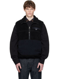 Wool-blend fleece vest. · Nylon faille trim throughout · Stand collar · Braided leather trim at half-zip closure · Flap pocket at chest · Zip pockets at waist · Bungee-style drawstring at hem · Piping at armscyes · Engraved oxidized silver-tone hardware Supplier color: Black Body: 64% polyester, 36% wool. Trim 1: 48% polyester, 43% wool, 9% nylon. Trim 2: 100% nylon. Trim 3: 100% leather. Lining: 100% polyester. Made in Japan 252688M185000