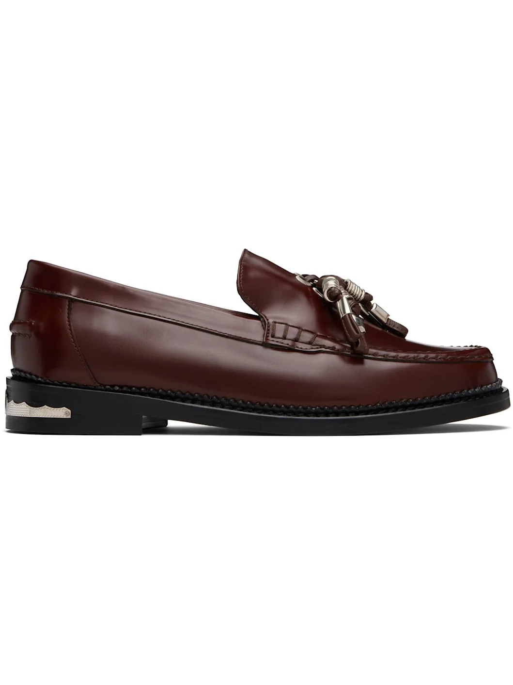 Buffed leather loafers. · Moc toe · Knotted strap with O-rings at vamp · Pinched seam at heel counter · Serrated edge at welt · Engraved plaque at heel · Stacked leather heel with rubber injection · Leather sole Supplier color: Brown Upper: leather. Sole: leather, rubber. Made in Portugal 252688M231024