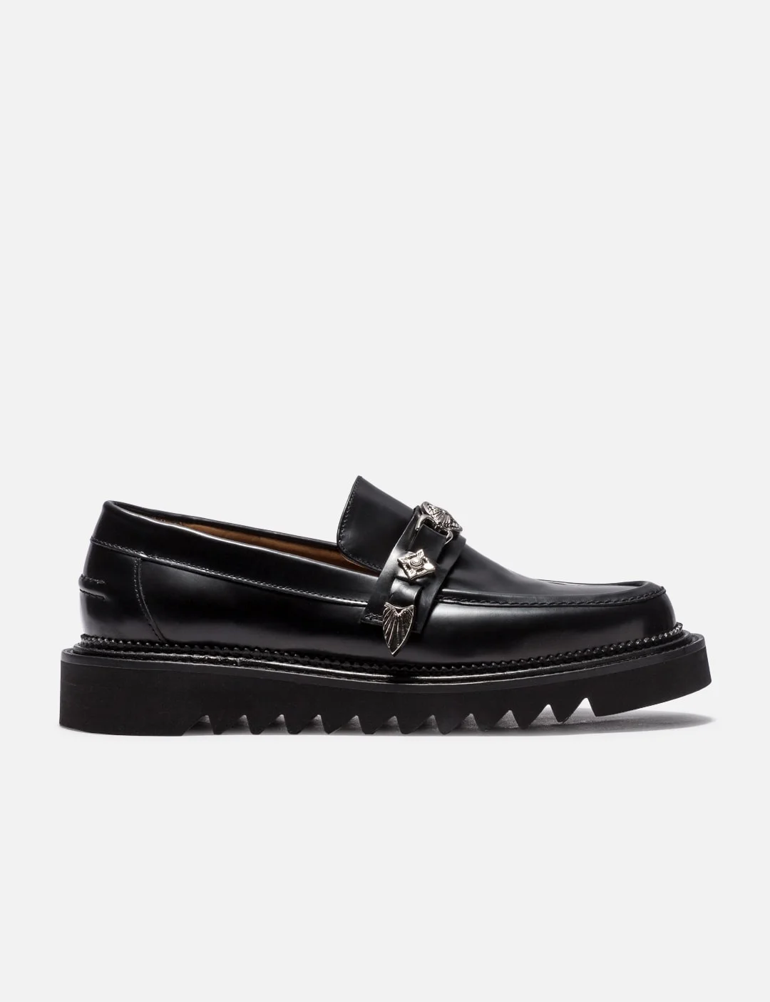 - Toga Virilis - Classic Bumper Loafers - Polido leather upper - Glossy and smooth leather surface - Slip-on - Rounded toe - Silver-tone hardware detail on strap - Metal plate details on heel - Leather lining - Chunky leather coated outsole - Color: Black - Material: Leather - See more Casual Shoes and Shoes