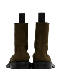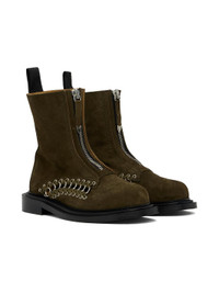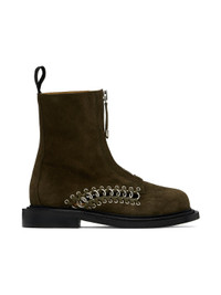 Ankle-high suede boots in khaki. · Zip closure · Cutout with lace-up detailing at sides · Webbing pull-loop at heel · Scalloped detailing at welt · Padded leather footbed · Buffed leather lining · Stacked leather block heel with rubber injection · Polished leather sole · Heel: H1" Supplier color: Green