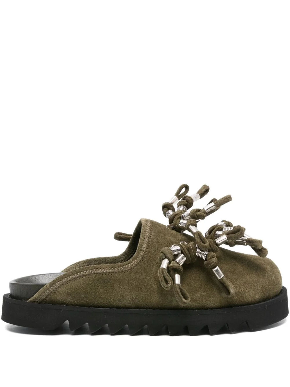 knotted-detail suede mules Highlights - Olive green - Suede upper - Knotted detail - Metal accents - Slip-on style - Rubber sole Imported Composition Lining: Polyester 50%, Polyamide 45%, Elastane 5% Sole: Rubber 100% Outer: Calf Suede 100%