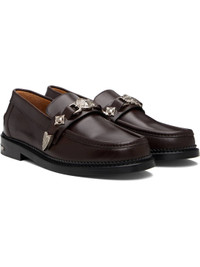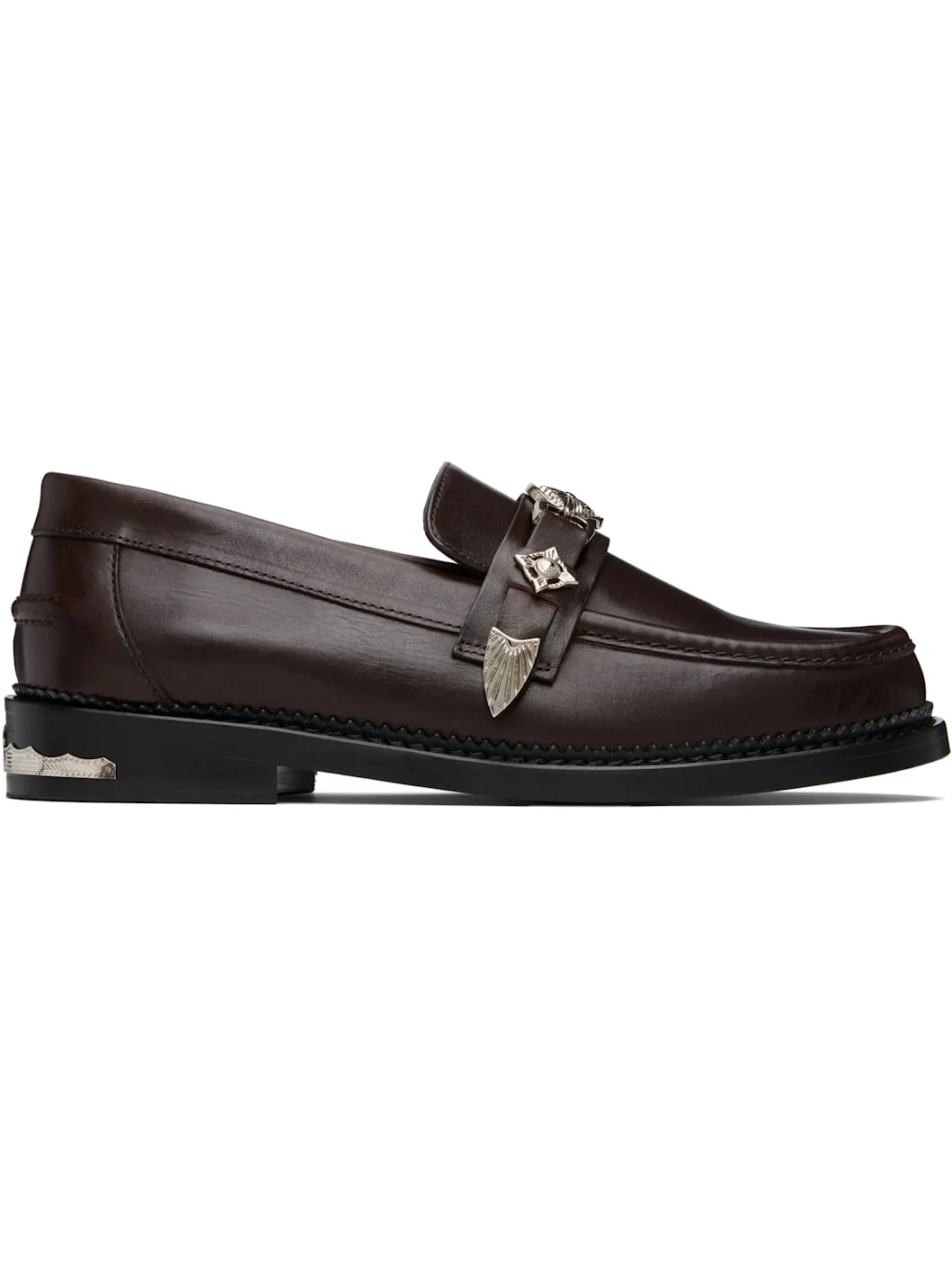 Buffed leather loafers. · Moc toe · Strap with graphic hardware at vamp · Pinched seam at heel counter · Serrated edge at welt · Engraved plaque at heel · Stacked leather heel with rubber injection · Leather sole Available exclusively at SSENSE. Supplier color: Dark brown Upper: leather. Sole: leather, rubber. Made in Portugal 252688M231011