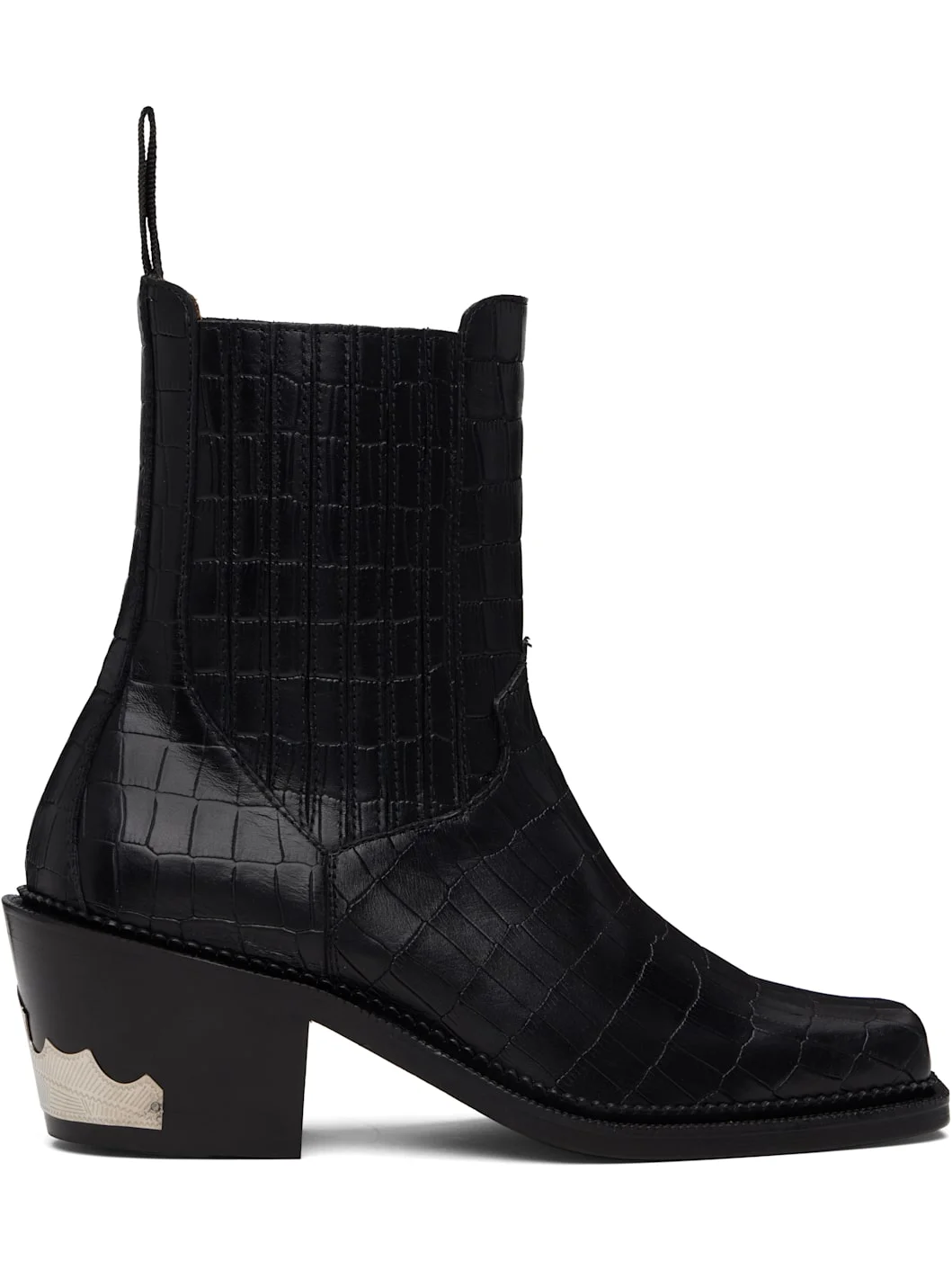 Ankle-high croc-embossed leather boots. · Square toe · Leather-covered elasticized gussets · Pull-loop at heel collar · Leather lining · Stacked leather heel · Treaded rubber sole · Heel: H2.75" Available exclusively at SSENSE. Supplier color: Black Upper: leather. Sole: leather, rubber. Made in Portugal 252688M223003